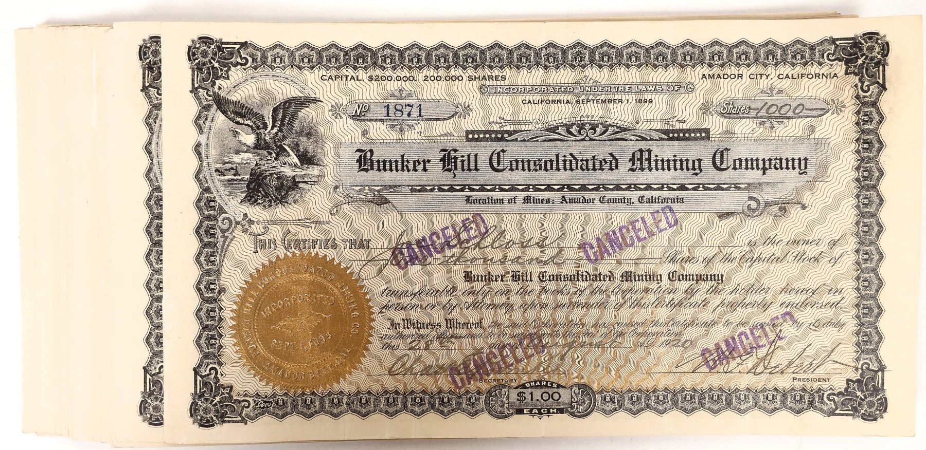 Bunker Hill Consolidated Mining Company issued and cancelled stock certificates. Mines are located in Amador County, California and is appears that most, if not all, were signed by company president W. Detert. Some have affixed revenue stamps. The company was incorporated September 1, 1899.