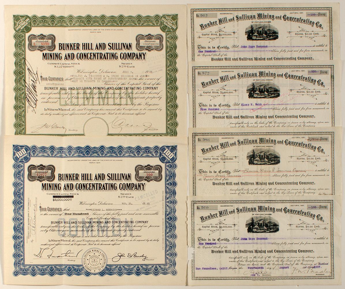 Bunker Hill & Sullivan Mining and Concentrating Co. Stock Certificates