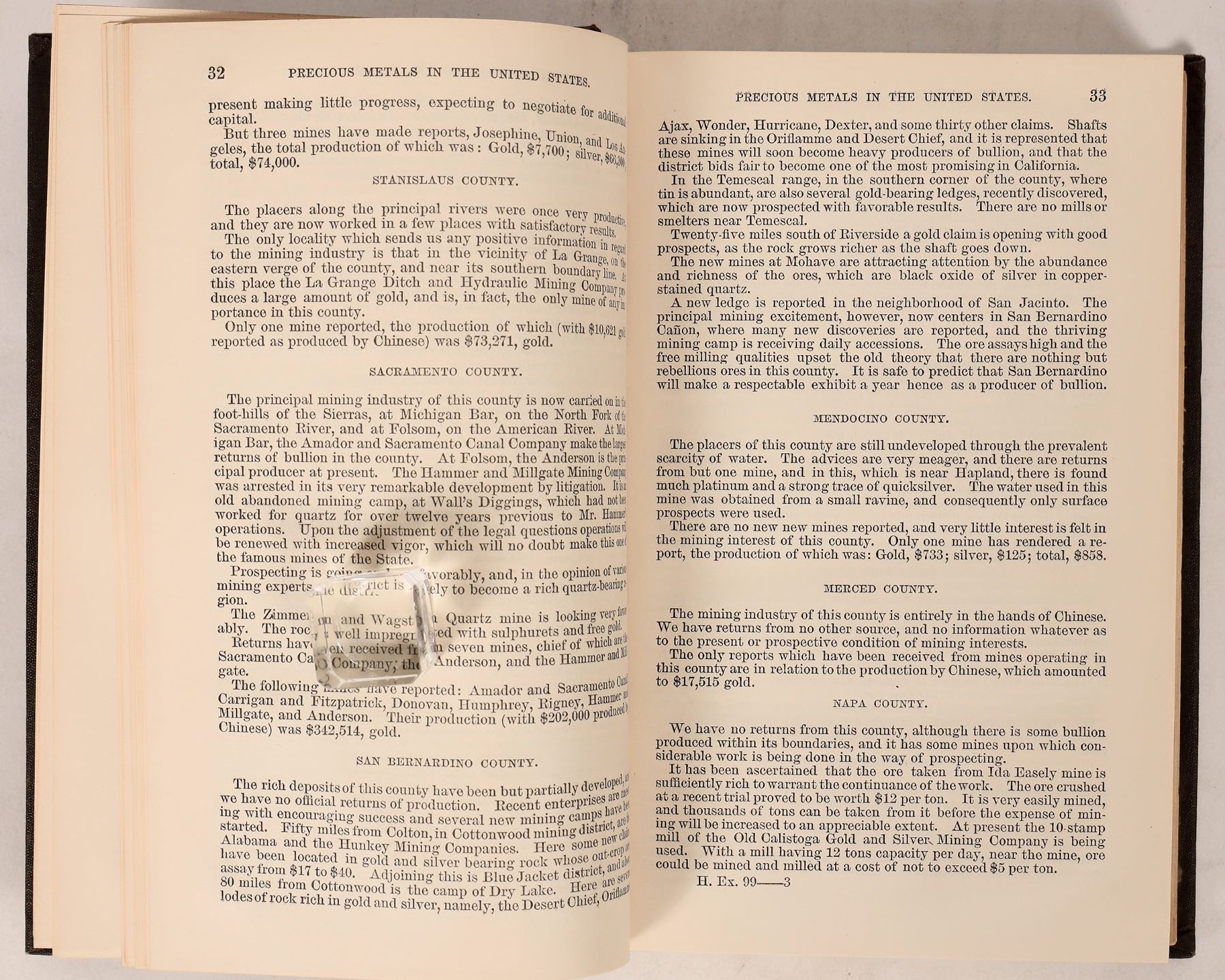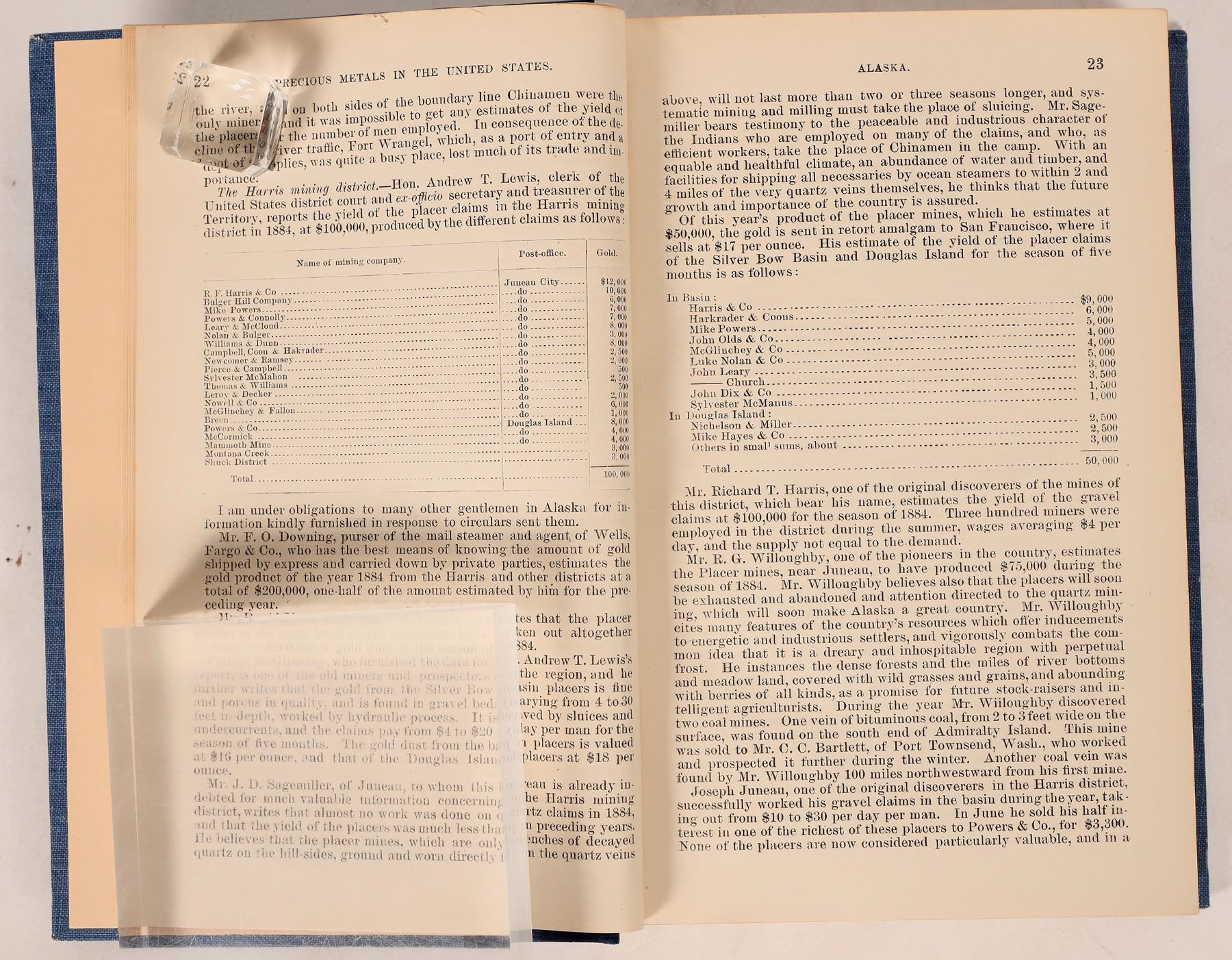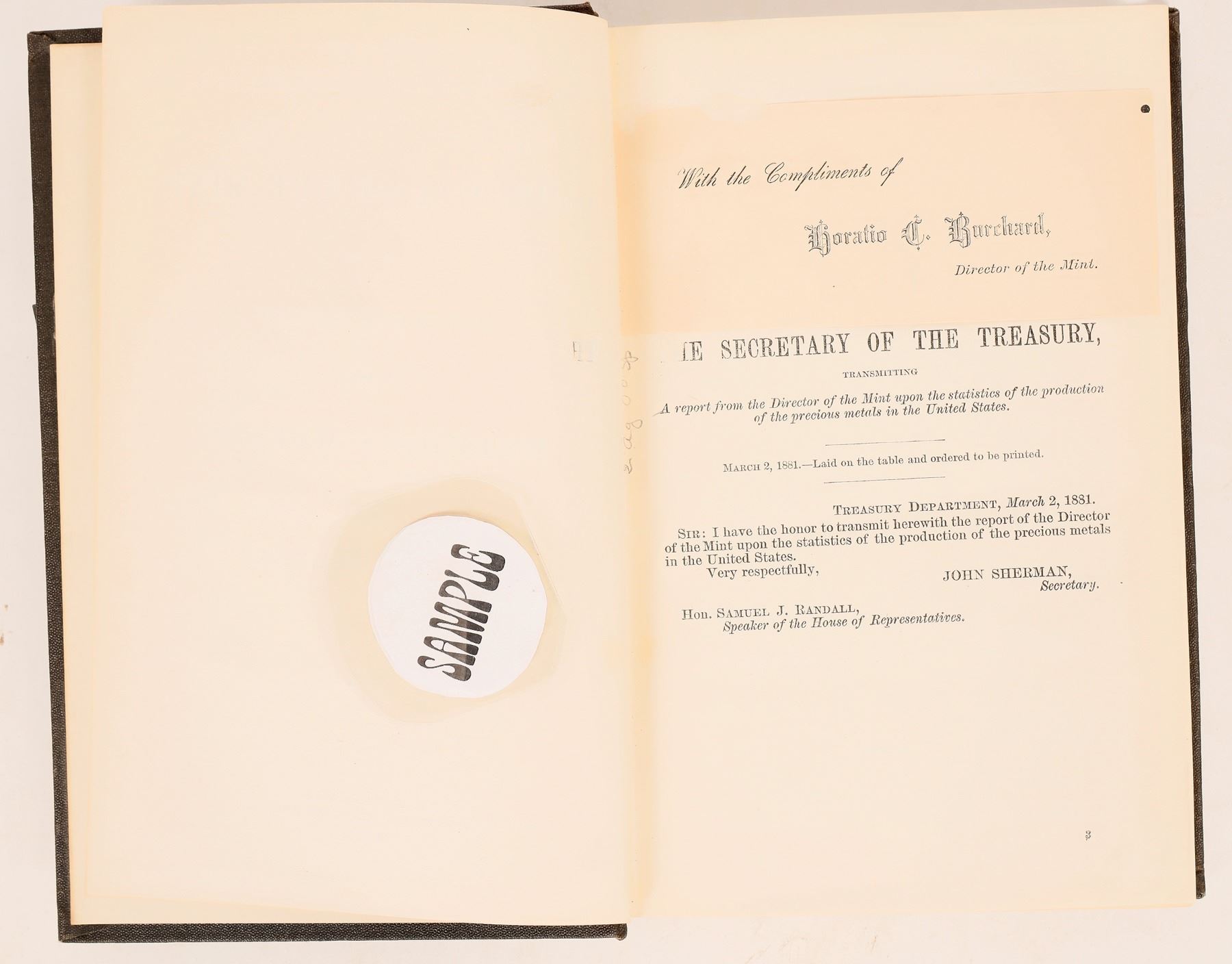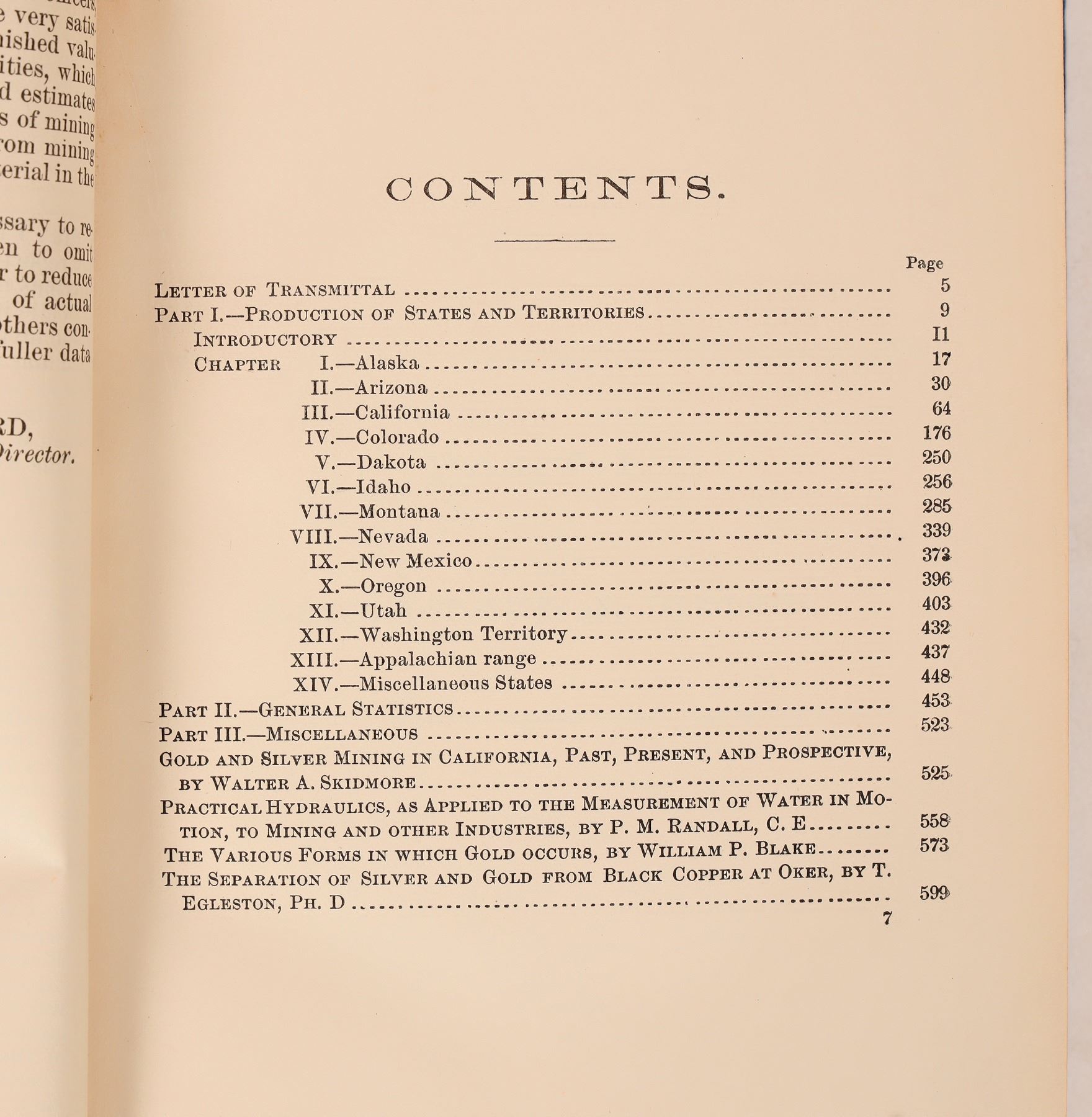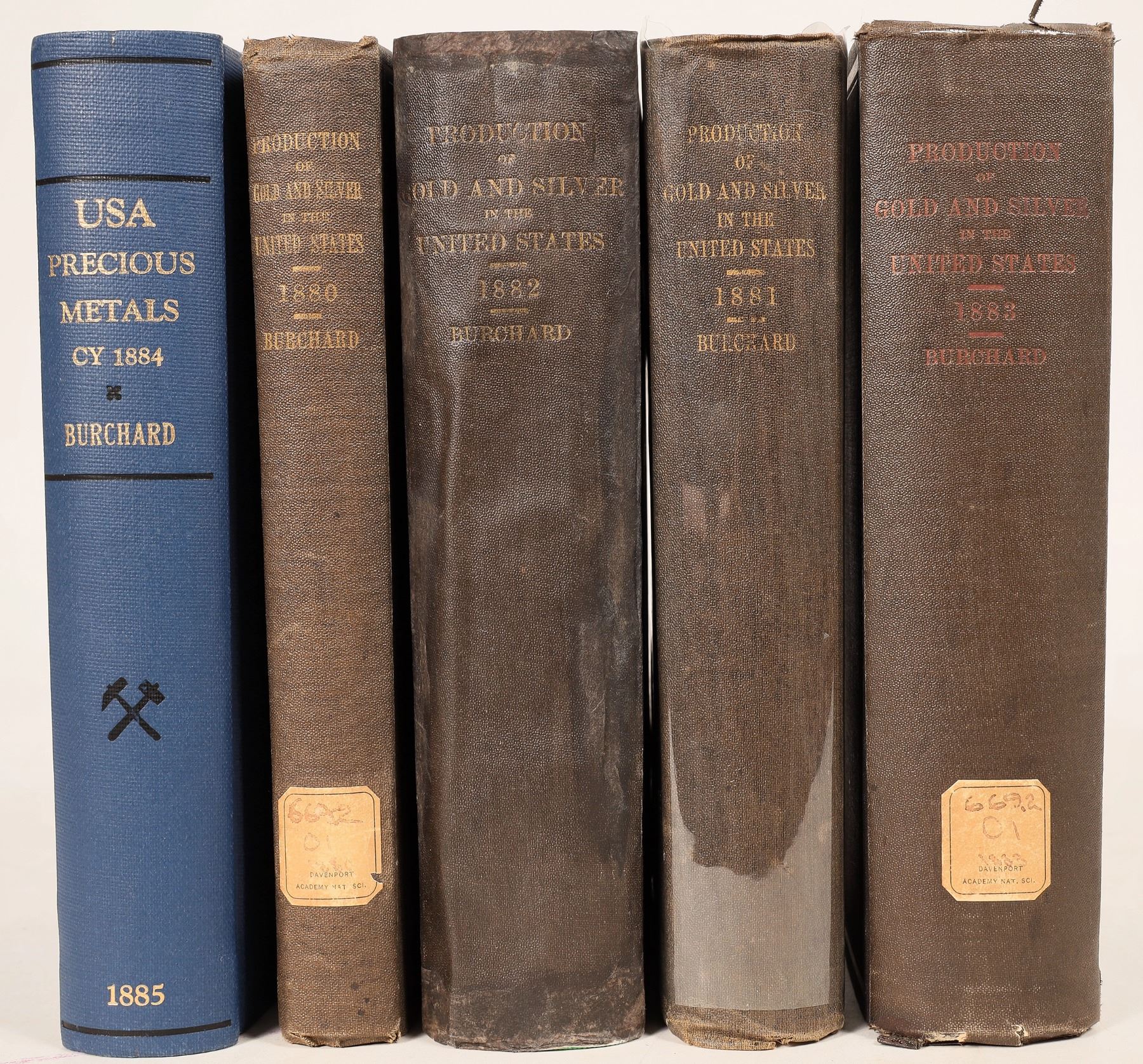 Horatio Burchard's follow-up to Ross Raymond's Minerals Resources West of the Rocky Mountains series. In this critical series, the Bureau covers the major ore deposit discoveries and production of the 1880s, inclusive of Bodie, Leadville and all over the West, The work is also triple indexed, as it Raymond. In this case, as well as Raymond, Burchard visited different mining districts each year, such that many districts have no reports during various years. As you can imagine, it was difficult to get around in 1880, thus Burchard had to pick and choose where he went, knowing full well that if he overdid it, the fed would not pay him, like they left Raymond and Browne out in the dark for some of their work.