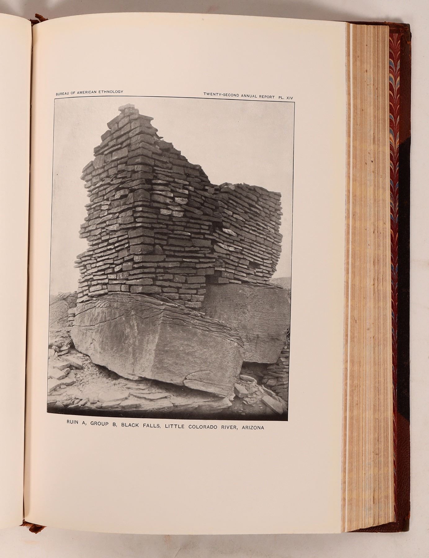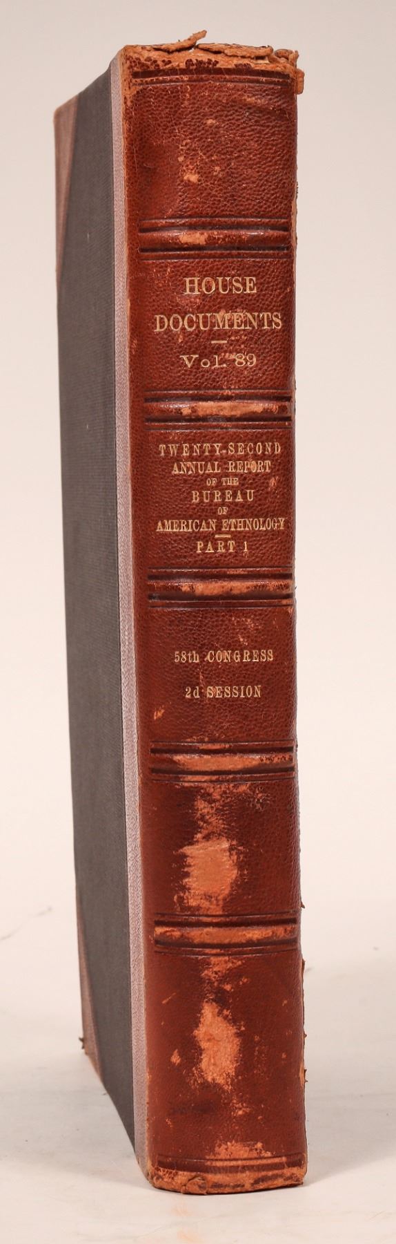 Twenty-Second Annual Report of the Bureau of American Ethnology to the Secretary of the Smithsonian Institution, 1900-1901, by J.W. Powell, director. 1904, Government Printing Office, Washington. In two parts. Part 1 - Accompanying papers about the Pueblo Ruins of the Little Colorado and Mayan calendar systems. Part 2 - Accompanying paper about The Hako, a Pawnee ceremony. With plates. 320 pp. 8" x 11.5". Front board detaching, scuffs on cover, upper & lower spine and corner wear, otherwise intact.