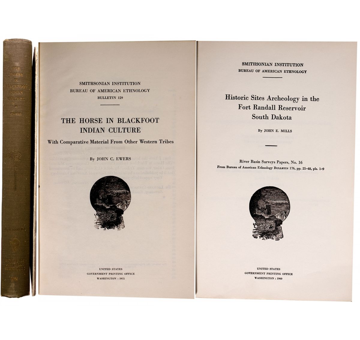 Lot of 2. 1) The Horse in Blackfoot Indian Culture. Ewers, John C. Bulletin 159. Ewers became interested in Plains Indians (specifically the Blackfoot tribe and its neighbors) while attending graduate school. He became Director of the National Museum of Technology and History and championed museums for numerous Native American tribes. This bulletin includes illustrations of techniques used by the Blackfoot tribe such as the method of wielding a lance by a mounted warrior. Hardbound in green cloth. 374 pp. 6" x 9". 2) Historic Sites Archaeology in the Fort Randall Reservoir South Dakota. Mills, John E. River Basin Surveys Papers, No. 16. A summary of the field activities concerning sites archaeology 1947-1952. Essentially a progress report of work done at historic sites in this area of South Dakota. Includes several plates of site excavation and artifacts found there. Soft cover/staple bound. 48 pp. 6" x 9". Date 1955, 1960 , SD hwac 2657