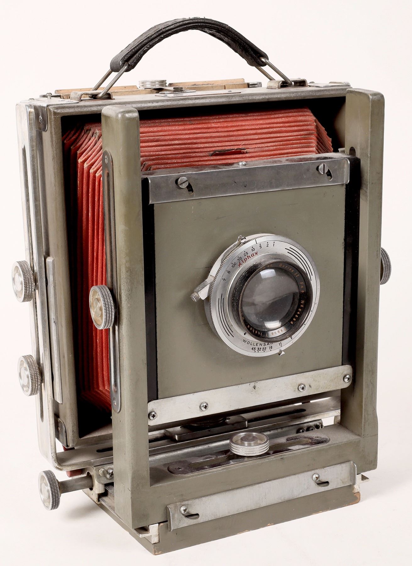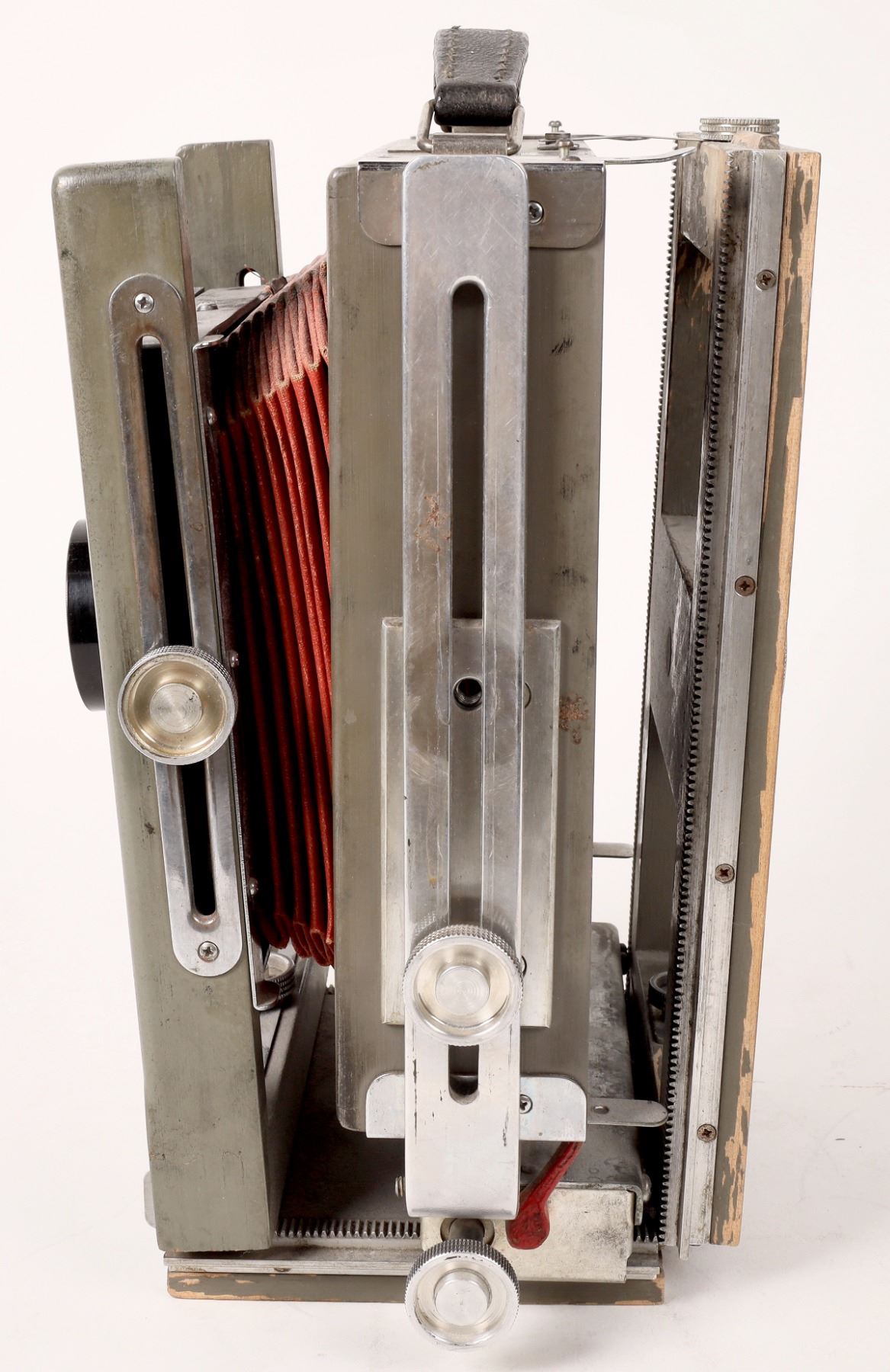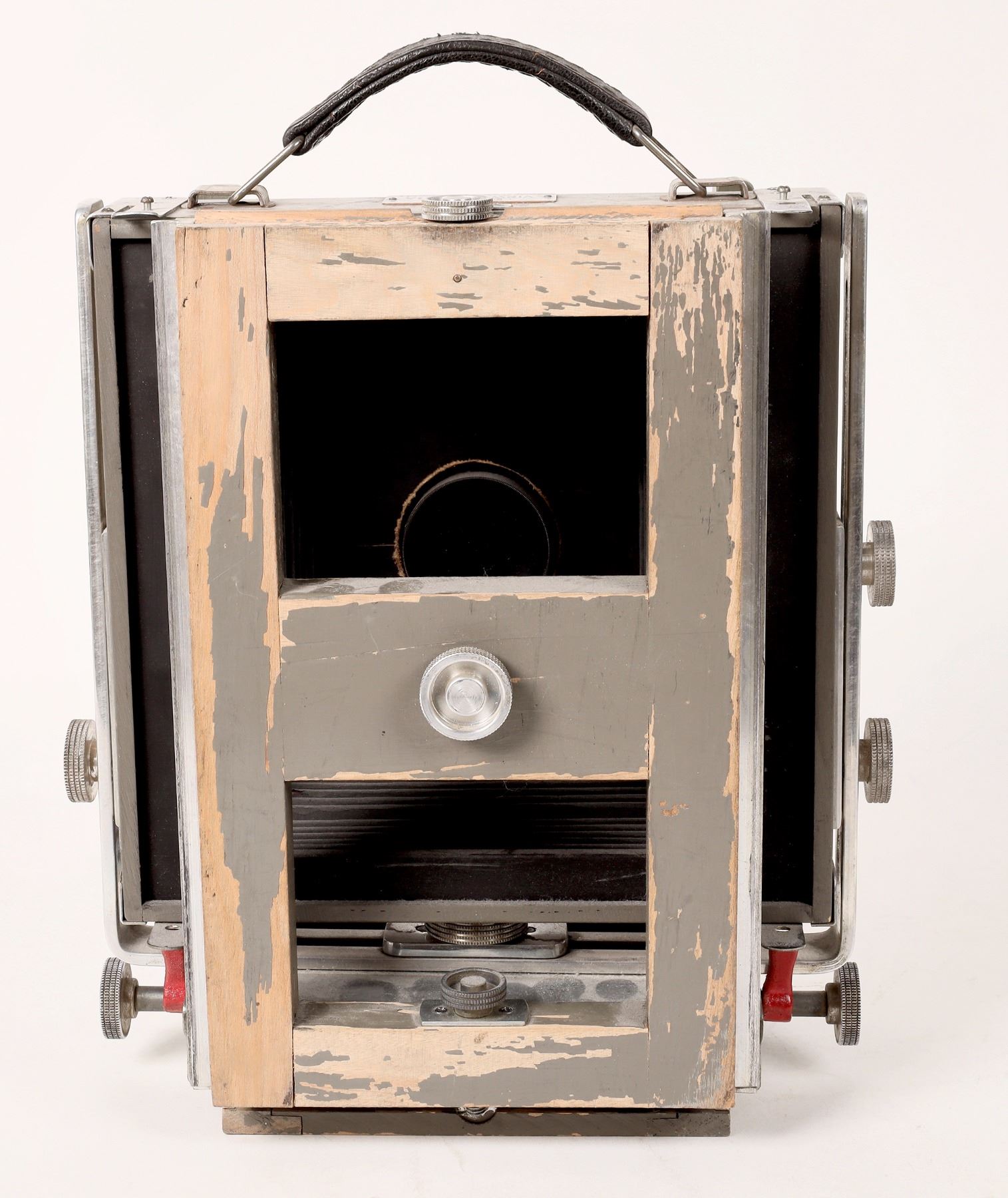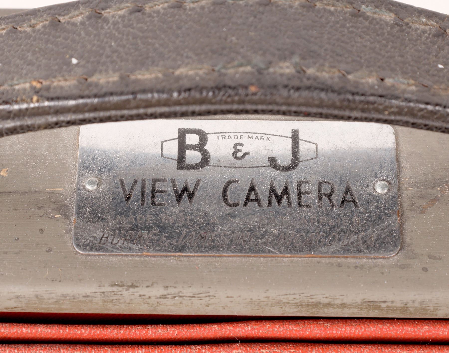 This is a Burke & James View Camera. Marked "B & J View Camera Chicago, Ill." Date of manufacture is unknown with "patent pending" only marking. The lense is a Wollensak Serie 11 F4.5. Orange bellows. The back plane is divided for two 3 in. 4in. plates. The shudder works beautifully. One turn screw missing. c.1920's.