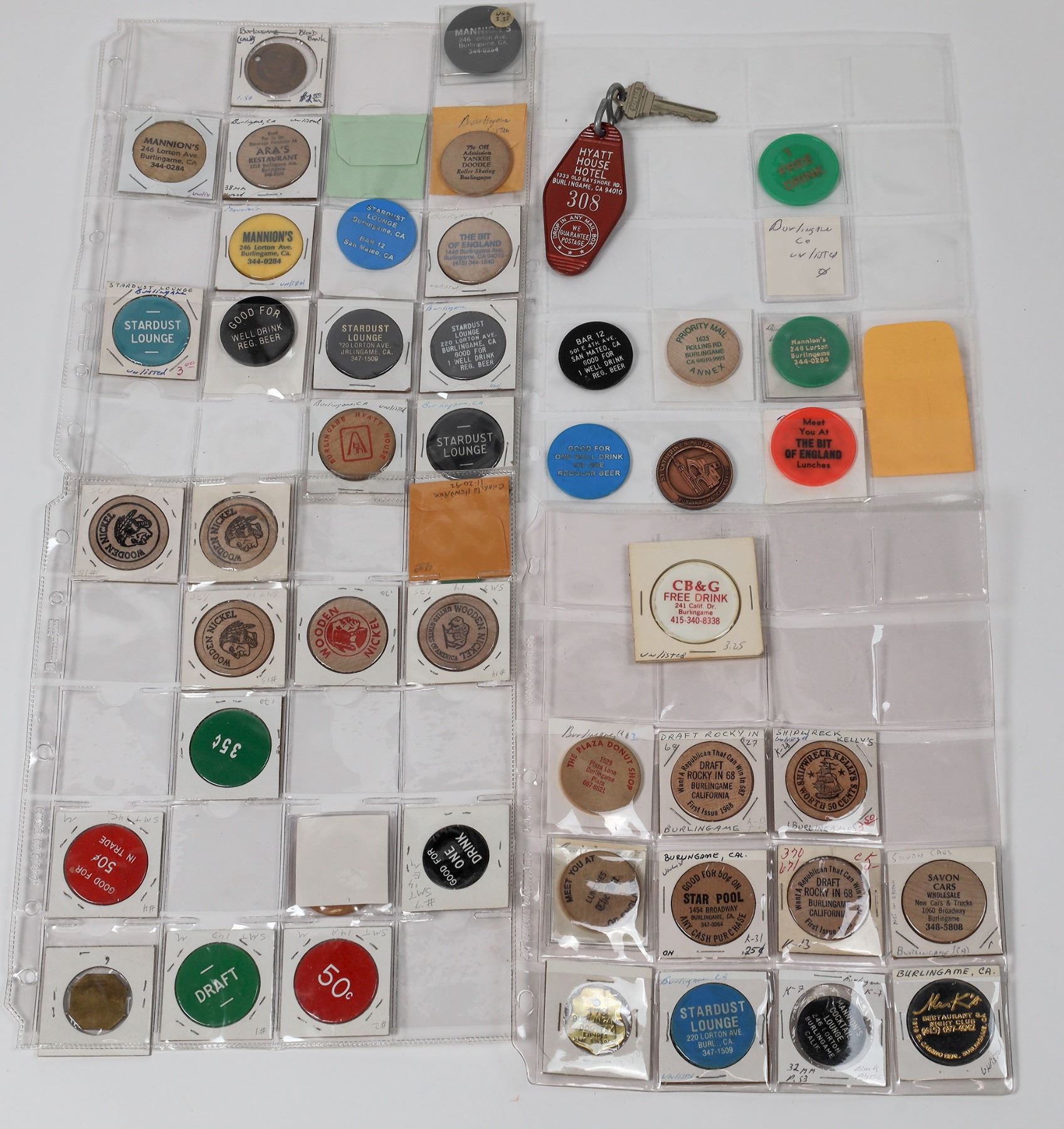 About 35 Burlingame tokens. Bar 12, The Bit of England, Mannion's, Stardust Lounge, Ara's Restaurant, Star Pool etc.