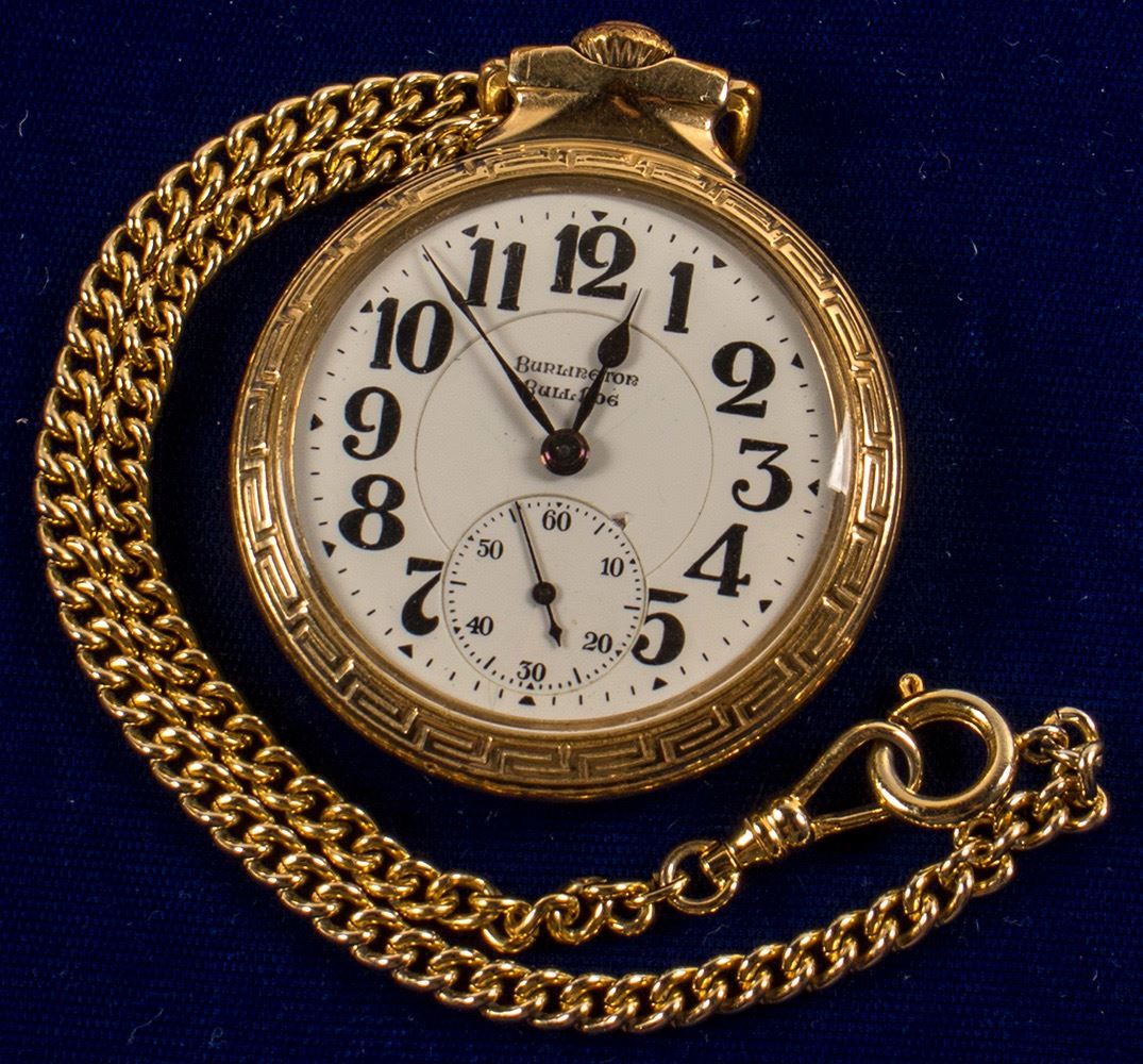 In the mid-1920s, the Burlington Watch Company offered its 16-size, 21-jewel Burlington Bull Dog. Also in a heavy duty RR case. There's nothing to distinguish the Burlington Bull Dog from the other 16-size, 21-jewel Burlington watches except the "Burlington Bull Dog" signature on the Dial. Chain is 12". Beautifully engraved back. See pictures for this beauty. City: State: Date: HWAC# 46219