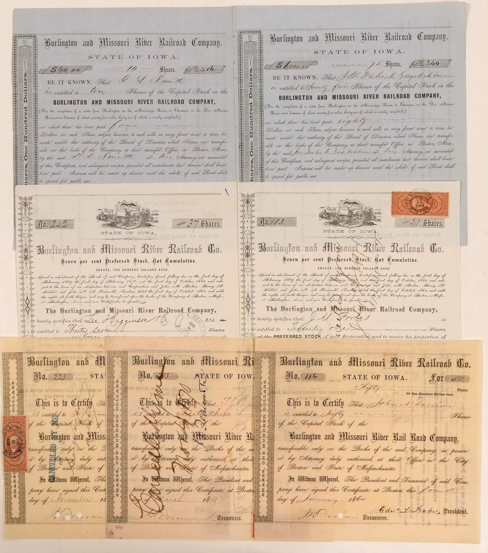 Seven stock certificates in this lot. Five common stocks issued in 1857, 1858, 1860,1868 and 1869. The certificates from the 1850's are black on blue and the 1860's stocks are black on white. No vignettes. All are cxled. Also, two preferred stocks, one issued in 1870 and the other is issued but not dated. However, there is a revenue stamp at top right that is stamped, "J.N. Denison, Feb. 11, 1868, Boston". The pfds. have the Iowa state seal vignette. Pen cxled.
