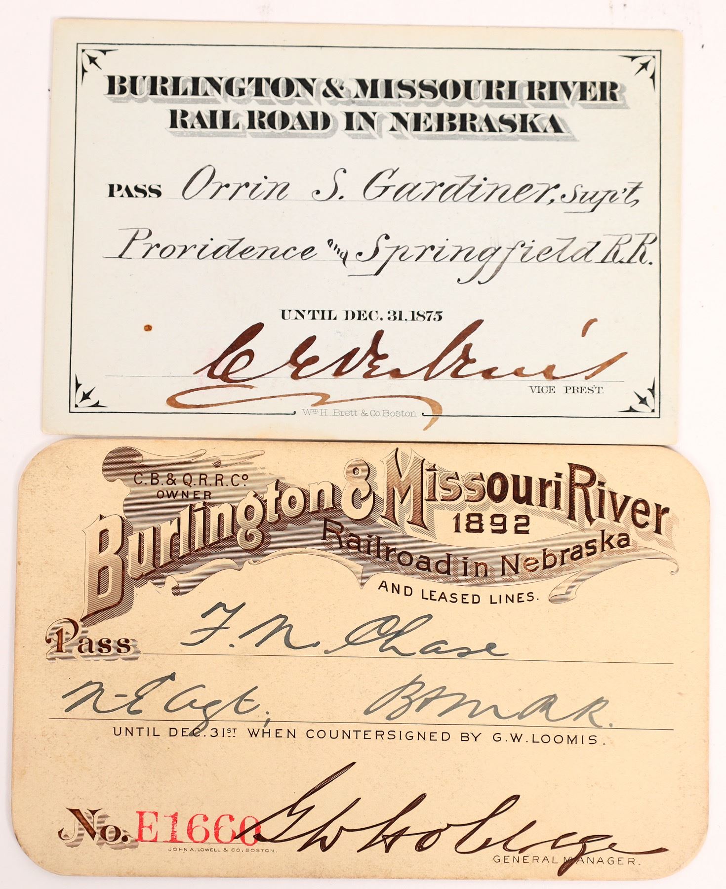 Lot of 2 different. 1) Pass issued for 1875 to Orrin S. Gardiner, supt. of the Providence & Springfield Railroad. Signed by the vice president (illegible). Black print. Printed by Wm. H. Brett & Co., Boston. 2) Pass no. E1660 issued for 1892 to Chase. Preprinted signature of the general manager. Countersigned on reverse by Loomis. Brown print on cardstock. Printed by John A. Lowell & Co., Boston. The Burlington and Missouri River Railroad was incorporated in Burlington, Iowa in 1852. It was developed to build a railroad across the state of Iowa. A sub-branch of the railroad was founded in Nebraska in 1869, with rails first entering the state in 1870 via Plattsmouth. That summer, the railroad reached Lincoln. It continued to lay rails westward and eventually joined with the Union Pacific Railroad on September 3, 1872 at Kearney. Became a subsidiary of Chicago, Burlington and Quincy Railroad.
