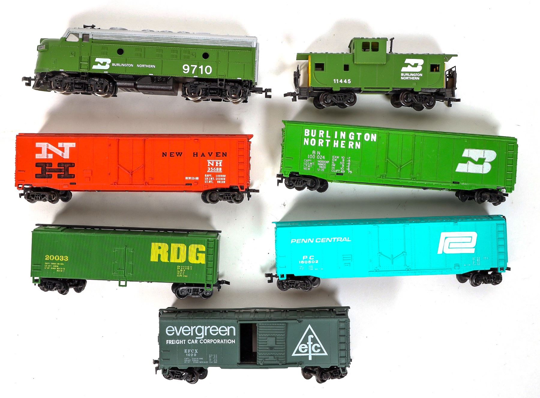 Lot of 7. Bachmann #9710 EMD F9 diesel Burlington Northern engine. Rolling stock: Burlington 50' box, New Haven 50' box, Penn Central 50' box, Evergreen 45'box, RDG 45' box, Burlington #11445 caboose. Manu: AHM, Bachmann. Never run, on display. C7