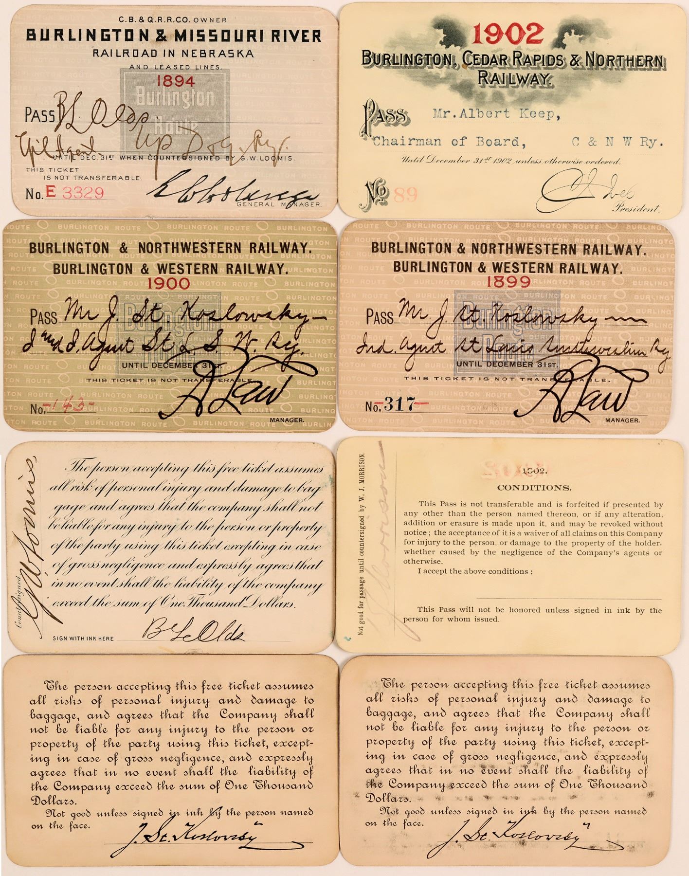 Lot of 4 from 3 different "Burlington" railroads. 1) Burlington & Missouri River Railroad in Nebraska. 1894. "Burlington Route" underprint. Printed sig. of general manager. Countersigned and endorsed. 2) Burlington, Cedar Rapids & Northern Railway. 1902. Signed by the president Web and countersigned. Logo in clouds vignette on cardstock. 3) Burlington & Northwestern Railway / Burlington & Western Railway. Two passes, 1899 and 1900. "Burlington Route" underprint.