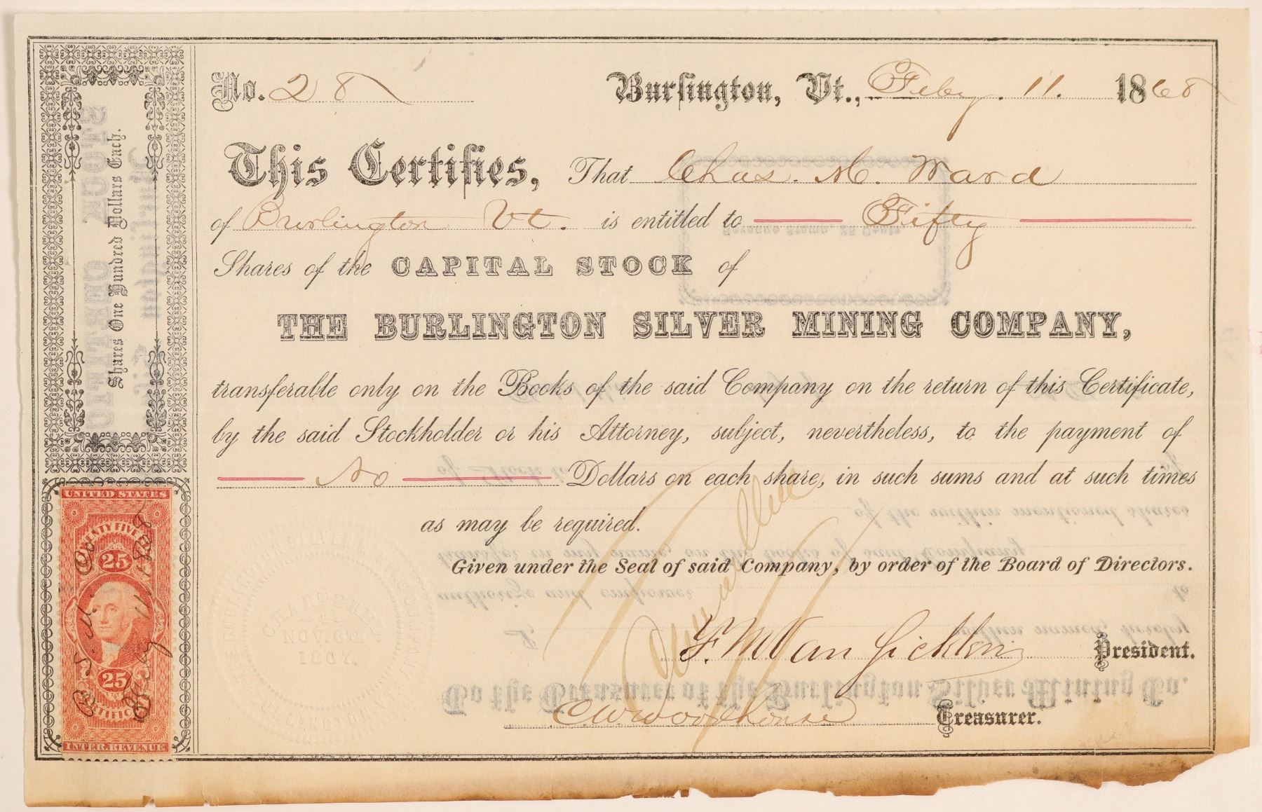 Stock Certificate from the Burlington SMC. Incorporated in 1867 in Burlington, Vermont. Located at Georgetown. Certificate number 28 issued in 1868 to Charles Ward. Signed by president F. M Van Likkin (?) and secretary (?). Not cancelled. 25 cent revenue stamp. Bottom right torn, please inspect online. Raised seal. The early promoters of Vermont returned to Georgetown and commenced work developing their claims, including the successful development of the New Boston Lode, one of the earliest producing loads in the region.