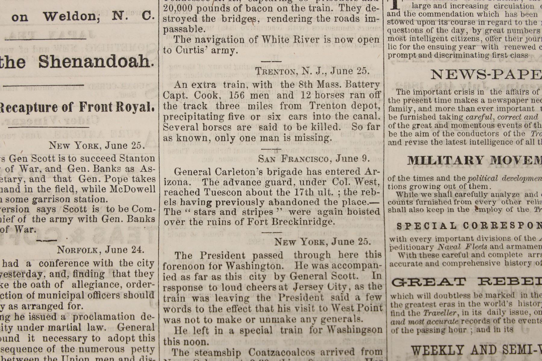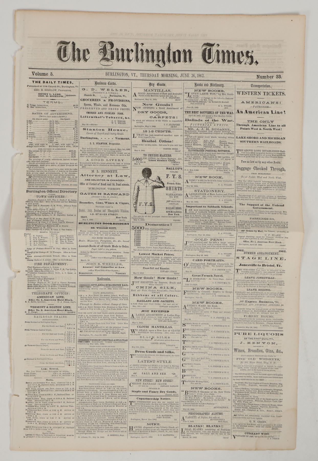 A full spread from the Burlington Times, Thursday Morning, June 26, 1862, Volume 5, Number 33 with "The Latest News. By Telegraph." on the Civil War. Including, "Exciting from Richmond!; The Impending Battle. The Ball Opened! Advance of our Pickets. Sharp Resistance of the Enemy. Their Batteries Silenced. Rebels Driven from Their Camp...." and more. Interesting mention on the back page from San Francisco, June 9 reads: "General Carleton's brigade has entered Arizona. The advance guard, under Col. West, reached Tucson about the 17th, ult.; the rebels having previously abandoned the place--The 'stars and stripes' were again hoisted over the ruins of Fort Breckinridge."