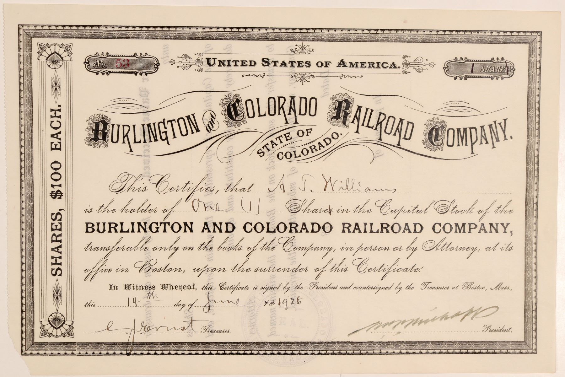Stock Certificate from the Burlington and Colorado Railroad Co. Incorporated in Colorado,. Certificate number 53 issued in 1926 to A. J. Williams. Signed by president and treasurer(?). Size 10.75 by 7.125 inches. Not cancelled. Bottom left corner torn. Otherwise nice. Black ink on onion-skin paper a bearing a crisp embossed seal in the lower center with the company name around the circumference. Lower left corner is torn, but all other edges and corners are intact. Does not appear to have been folded. Operated from 1881 to 1908 on the Chicago, Burlington and Quincy system.