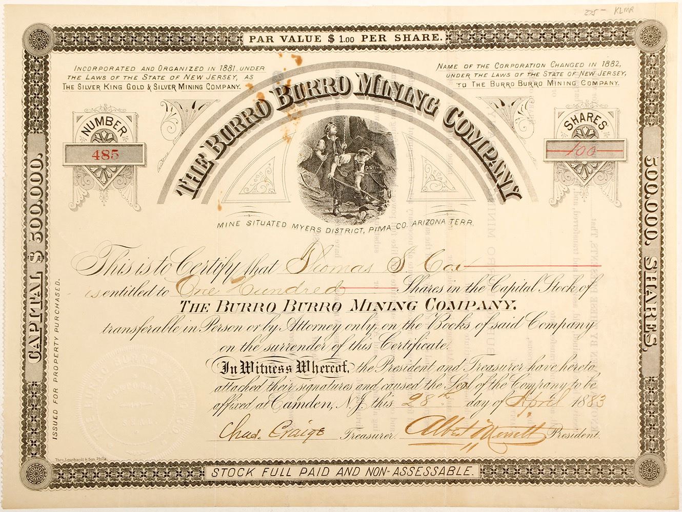 Scarce. Number 485 for 100 shares to Thomas S Cox. Signed by secretary Charles Craig and president Albert Minilt(?). Foxing top middle. Two vertical folds. Small underground mining vignette of miners filling ore bucket. Organized in 1881 as The Silver King Gold & Silver Mining Company. The name was changed in 1882 to The Burro Burro Mining Company". HWAC# 60679 Date: 1883 Location: Myers Mining District, Pima, Arizona