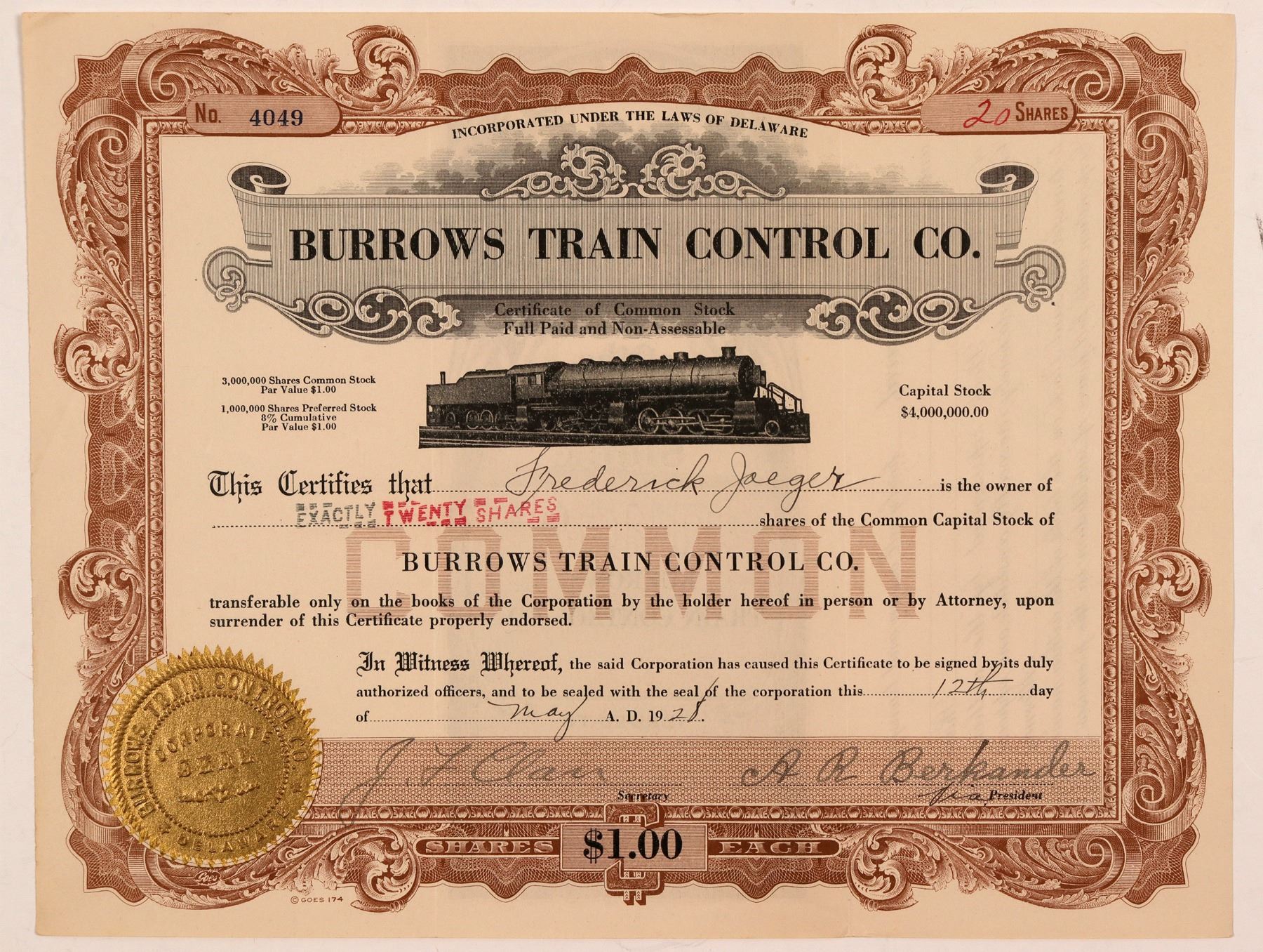 Inc. in Delaware. No. 4049, issued for 20 shares to Frederick Jaeger on May 12th, 1928. Signed by vice president AR Berkander and secretary J. Clair. Not cancelled. Brown border, gold seal, black print, and train vignette. Printed by Goes.8.25 x 11" Folds, crease. The successor of the M. V. All-Weather Train Control of New York City. Developed a brake-setting apparatus. Charles Burrows was the consulting engineer. [See: Railway Age and Railway Review, Volume 72, Issue 1] Ken Prag Collection