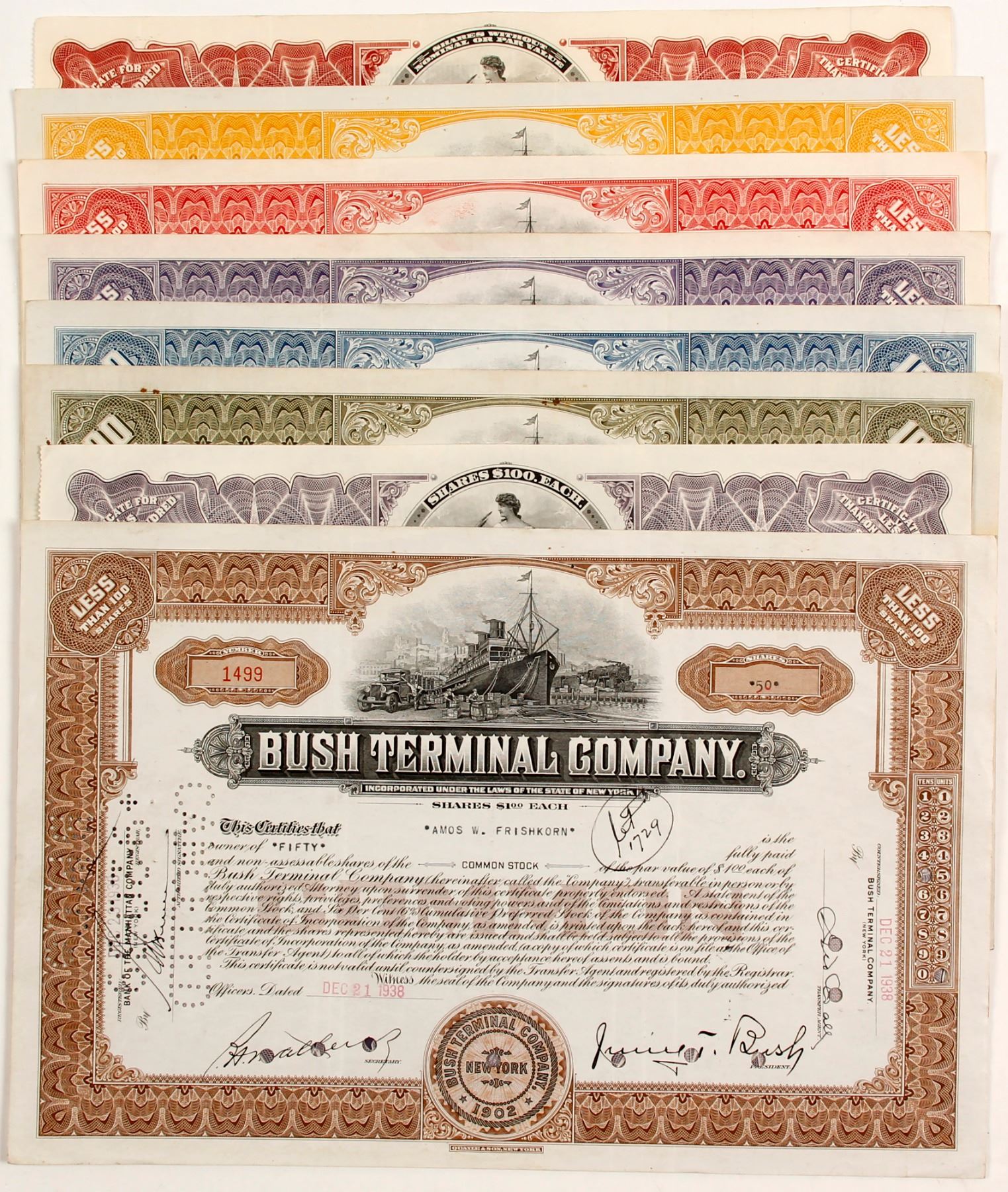Eight cancelled stock certificates for Bush Terminal Company printed by Quayle & Son. 1) 100 shares for Frederic B. Studwell dated October 26, 1937. Certificate number 16152. 2) 100 shares for Max Friedman dated May 29, 1940. Certificate number 6521. 3) 50 shares for Amos W. Frishkorn dated December 21, 1938. Certificate number 1799. 4) 10 shares for Joseph A. Farley dated May 9, 1932. Certificate number 11434 5) 5 shares for DeCoppet & Doremus dated June 9, 1936. Certificate number 14354. 6) 5 shares for Jacquelin & Deooppet dated Feb 3, 1937. Certificate number 037740. 7) 2 shares for Marie Biornstad dated April 7, 1939. Certificate number 871. 8) 1 shares for Mary Cramer dated July 2, 1932. Certificate number 032537. Bush Terminal is named after its founder Irving T. Bush. In 1895, he obtained six warehouses and a pier started a terminal that would handle freight.
