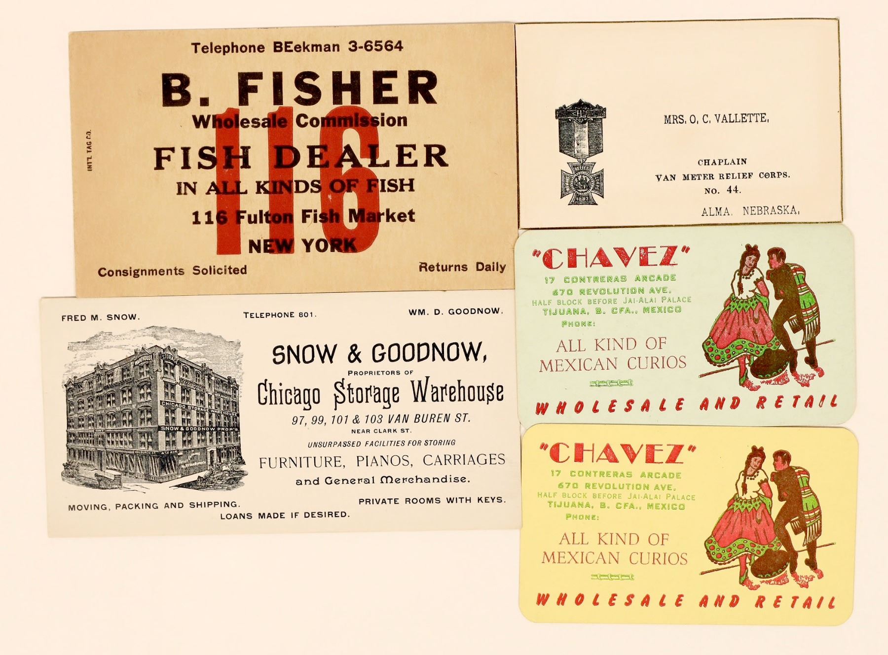 Lot of 5. Two cards from "Chavez" curios w/1952 calendars on reverse. Snow & Goodnow Chicago warehouse. B. Fisher, fish dealer NY. Business card of Chaplin for World Relief Corp. 1800's. All in plastic sleeves.