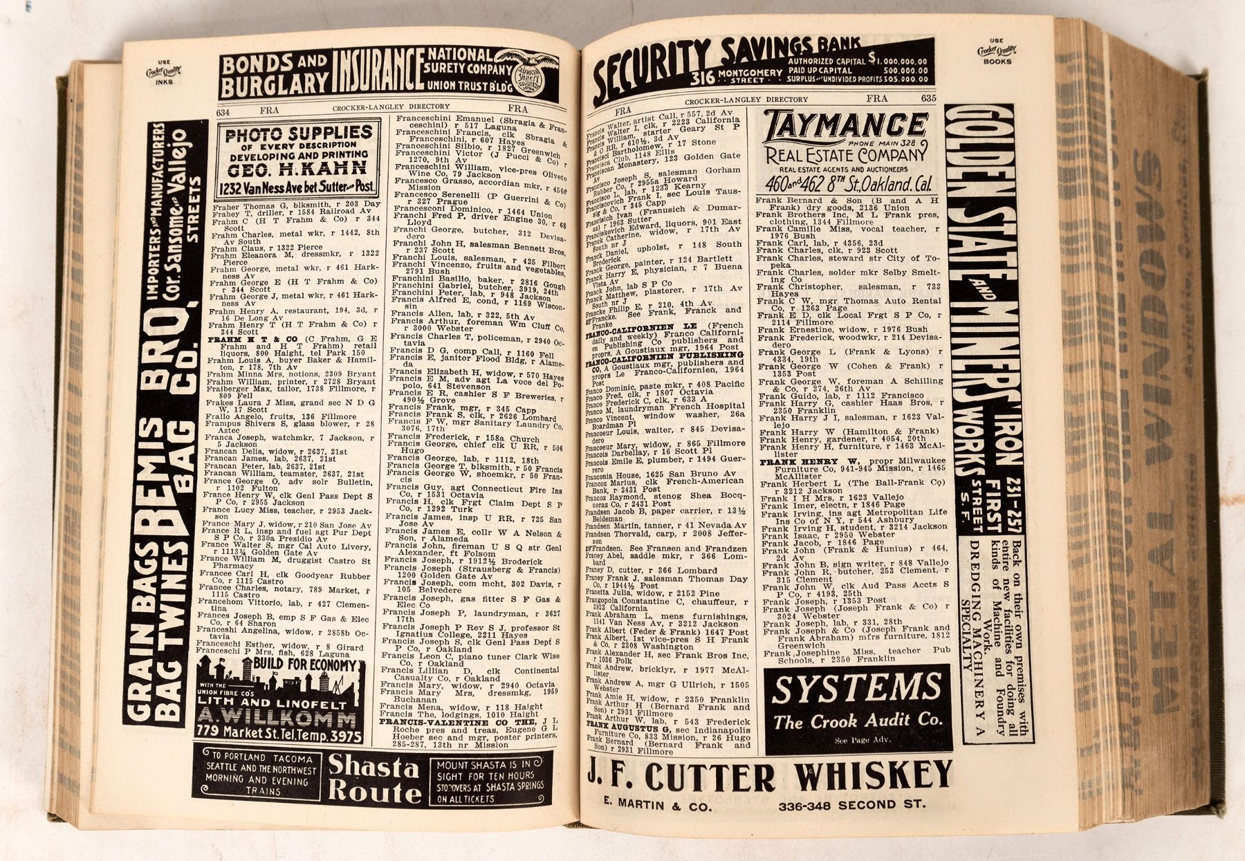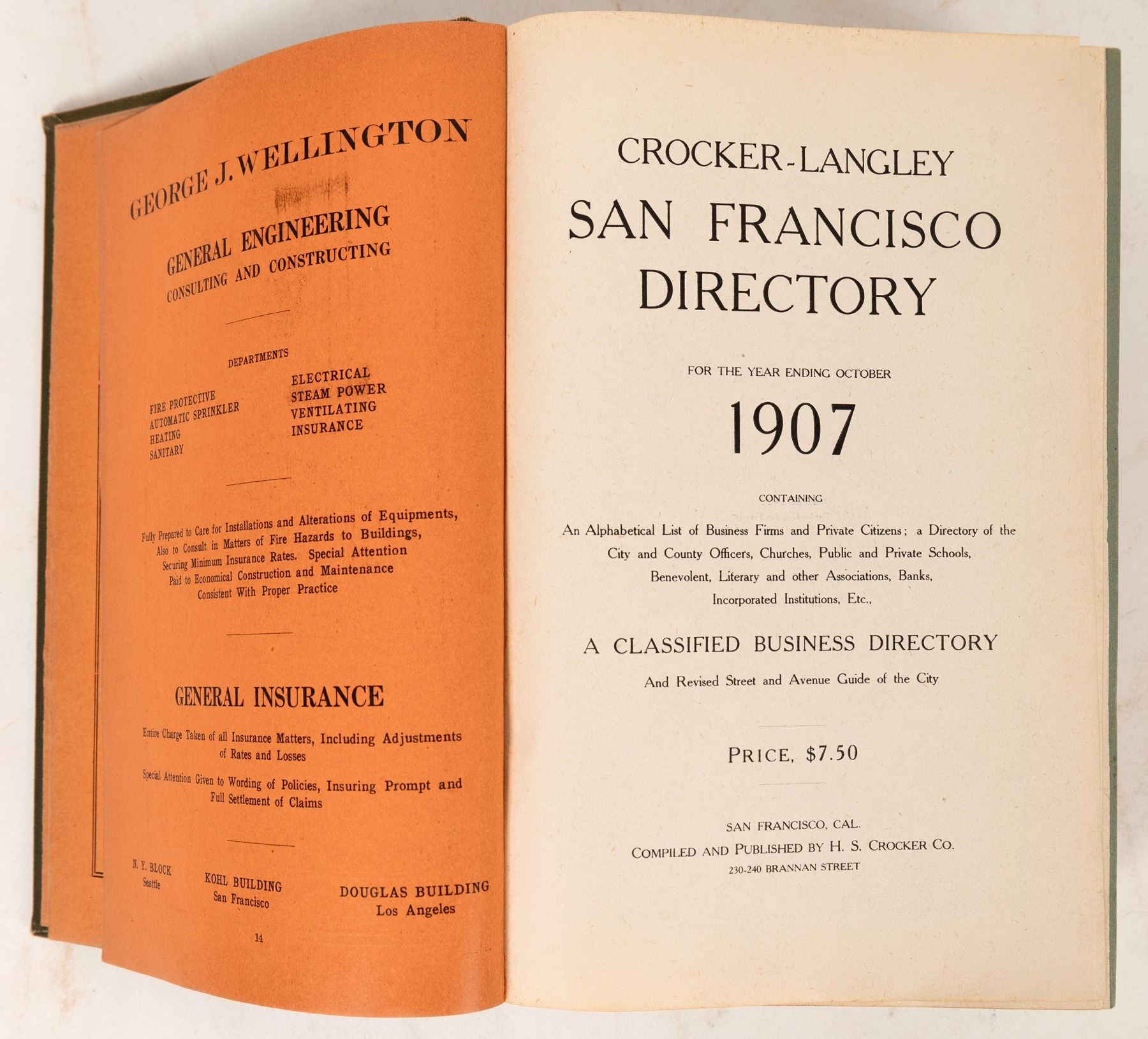 A business directory of San Francisco from 1907. This is an important business guide, coming only a year after the earthquake and fire. Hardcover is absent some of the embossing and spine shows some weakness. A nice addition to any historical book collection. San Francisco California 1907