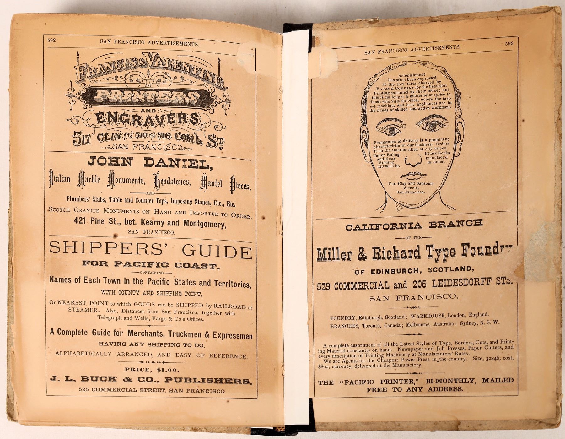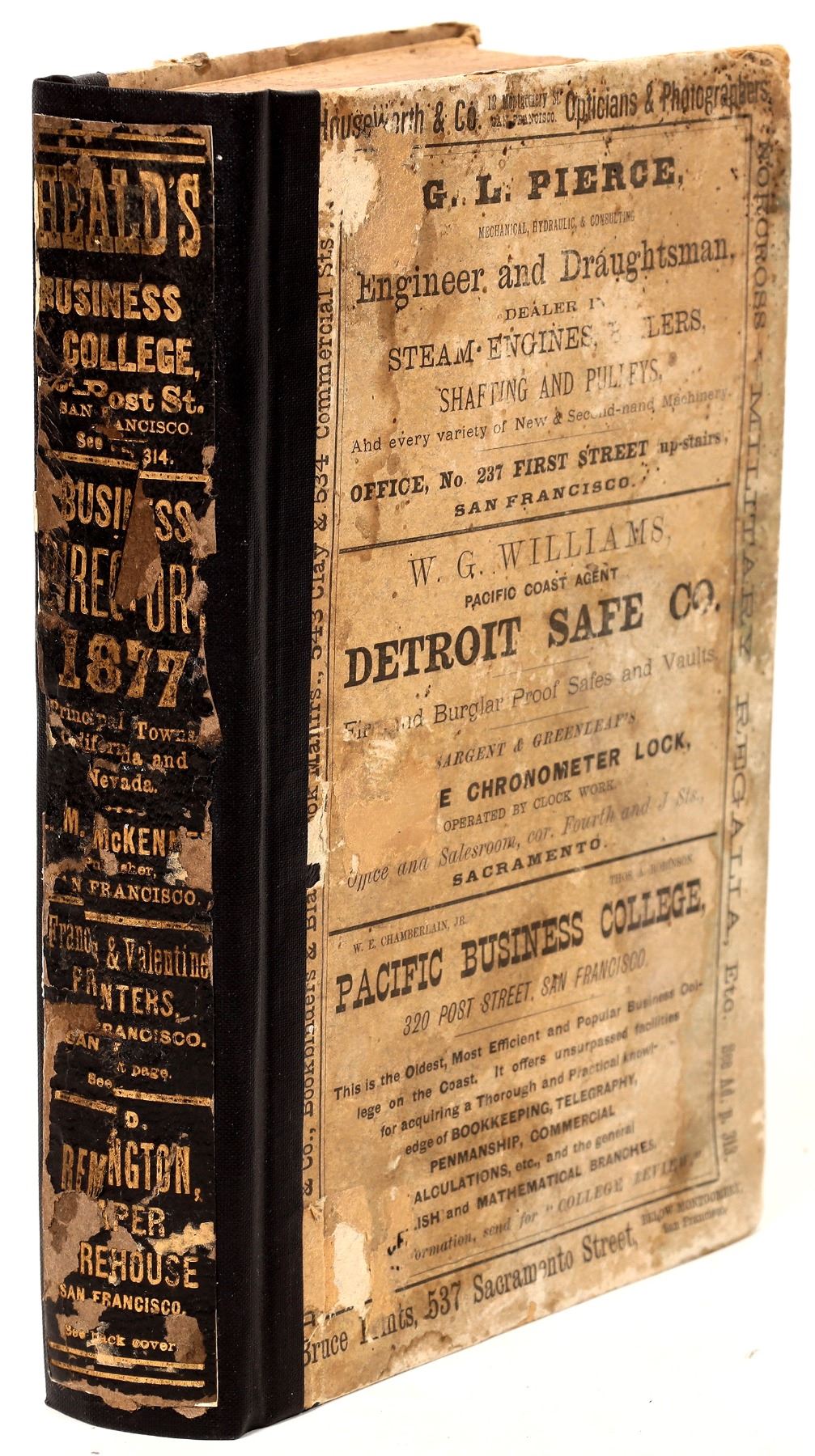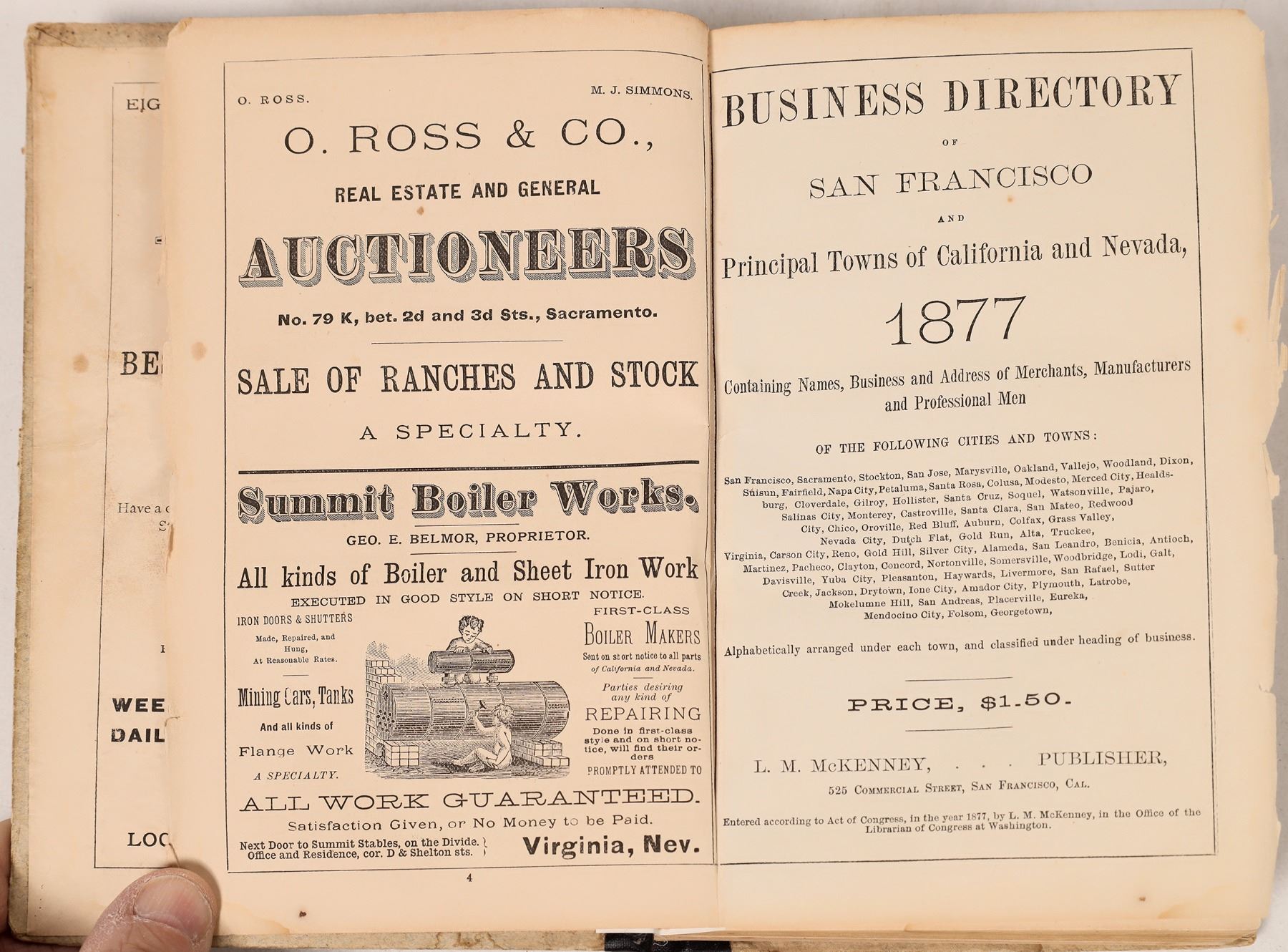BUSINESS DIRECTORY OF SAN FRANCISCO AND PRINCIPAL TOWNS OF CALIFORNIA AND NEVADA, 1877: CONTAINING NAMES, BUSINESS AND ADDRESS OF MERCHANTS, MANUFACTURERS AND PROFESSIONAL MEN.... [San Francisco]: L.M. McKenney, [ca. 1877]. [3], 593pp. including pastedowns. Original printed boards, original backstrap preserved. Boards moderately rubbed and worn. Contemporary ink signature on front board, foredge, front pastedown, and titlepage. Rebacked with original binding label, overall, very good. The titlepage lists eighty towns and cities, those of gold rush fame prominent among them. With numerous advertisements, the first three and pages 235-314 and 581-593 are full page advertisements (many illustrated) with other mini advertisements throughout. The first section contains a directory of California businesses alphabetically by City and Town followed by a listing by business type. Next comes Nevada by business type and finally a section focused on San Francisco with listing both alphabetically and by business. Listings and advertisements include Assayers, Lists of Mines and Mining Engineers. This was a key edition since it was timed with the peak of the Comstock Bonanza Boom. In very good condition. P-1500. San Francisco California 1877