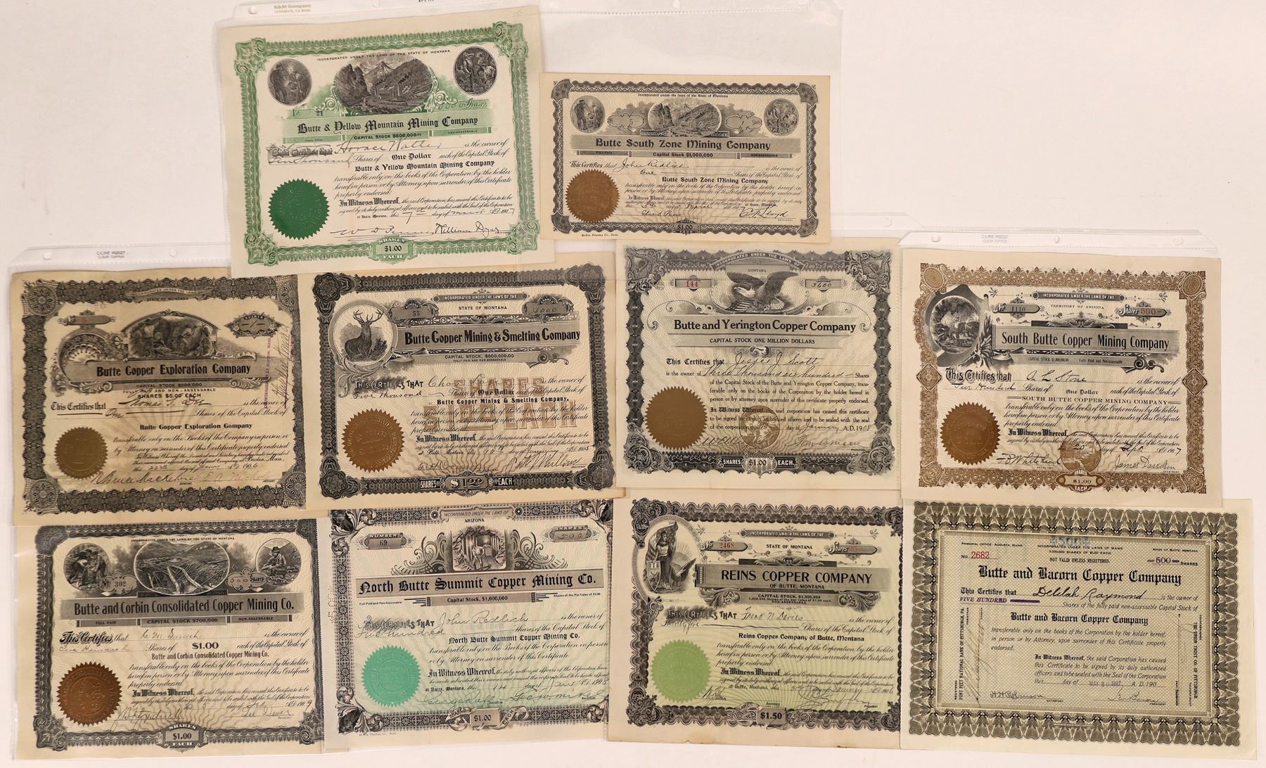 Lot of ten. Includes 1) Butte South Zone Mining. Early # 5 for 1 share to John Redlich. Signed by CA Lloyd. 1907. 2) Reins Copper 1906. 1910/11 Copper Handbook reported 2,061 tons of ore with 4.7% copper. "Condition is apparently hopeless!" 3) North Butte Summit Copper 1908. Idle since organization. 4) Butte and Crobin Consolidated. In October 909 they started a new tunnel. Butte in title. Also # 21 Butte and Yellow Mountain 1907, South Butte Copper 1907, Butte and Yerington Copper 1908, Butte Copper Mining & Smelting 1905, Butte Copper Exploration 1906 and Butte and Barorn Copper 1907 signed by Barorn. [Notes from the Copper handbook]