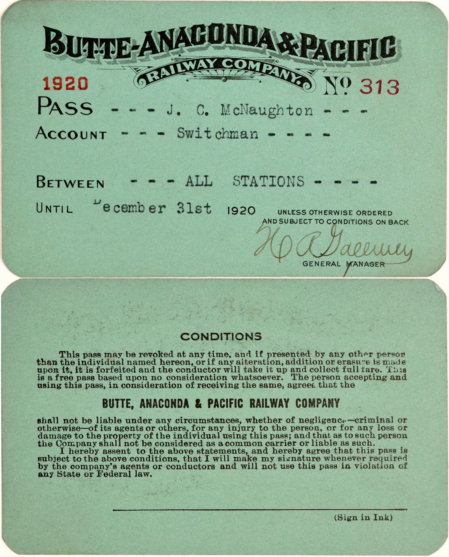 Pass No. 313, issued for 1920 to JC McNaughton, Switchman. Signed by the General Manager. Not endorsed on the reverse. Black and red print on blue cardstock. Very good condition. Founded in 1892 by people involved with the Anaconda Copper Mining Company. While its primary purpose was to carry copper ore from Butte to the smelters at Anaconda, Montana, it was also chartered as a common carrier and carried passengers and general freight.