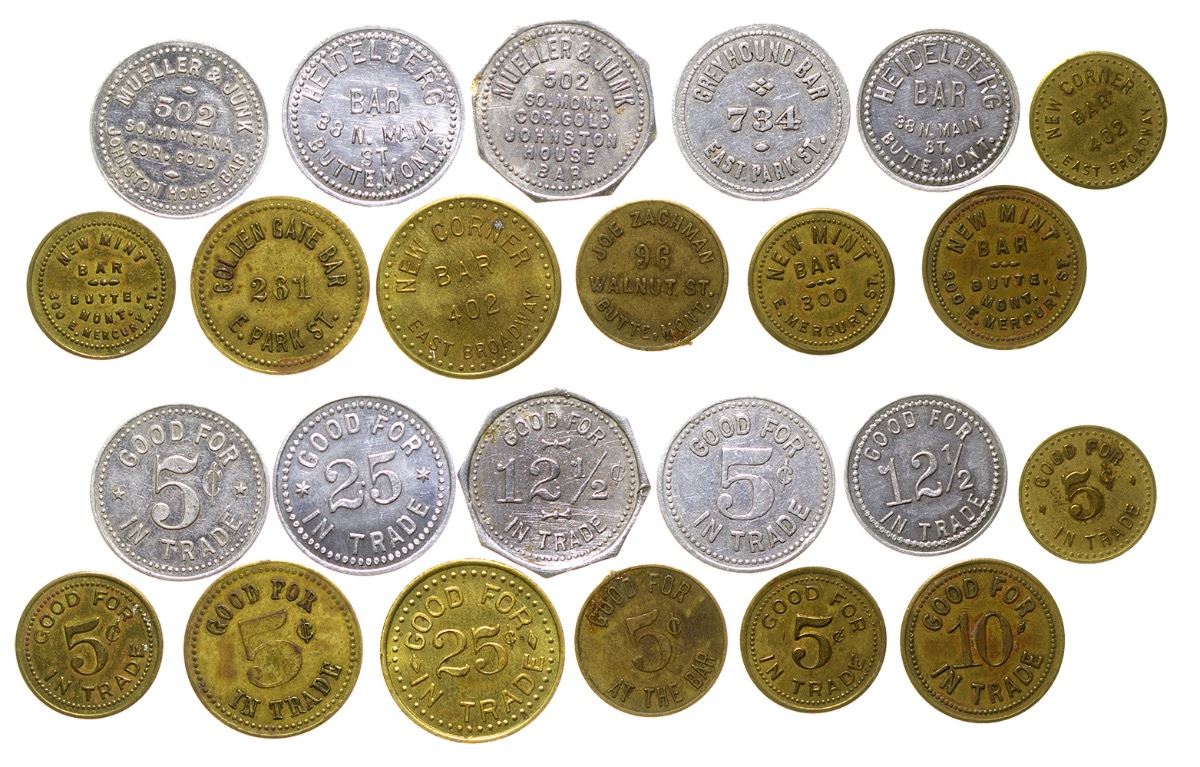 Lot of twelve. 1) R-7. Round. Brass. Joe Zachman / 96 Walnut St. / Butte, Mont. // GF / 5c / At the Bar. 2) R-6. Round. Aluminum. Type I. Mueller & Junk / 502 / So. Montana / Cor. Gold. / Johnstone House Bar // GF 5c IT. 3) R-6. Octagon. Aluminum. Type II. Mueller & Junk / 502 / So. Mont. / Cor. Gold / Johnstone / House / Bar // GF 12 1/2c IT. Also Greyhound Bar 5c IT, Golden Gate Bar 5c IT, New Corner Bar 25c IT, New Corner Bar 5c IT, Heidelberg Bar 25c IT, Heidelberg Bar 12 1/2c IT, New Mint Bar 10c IT, and New Mint Bar 5c IT. City: Butte State: Montana Date: ID: 37151