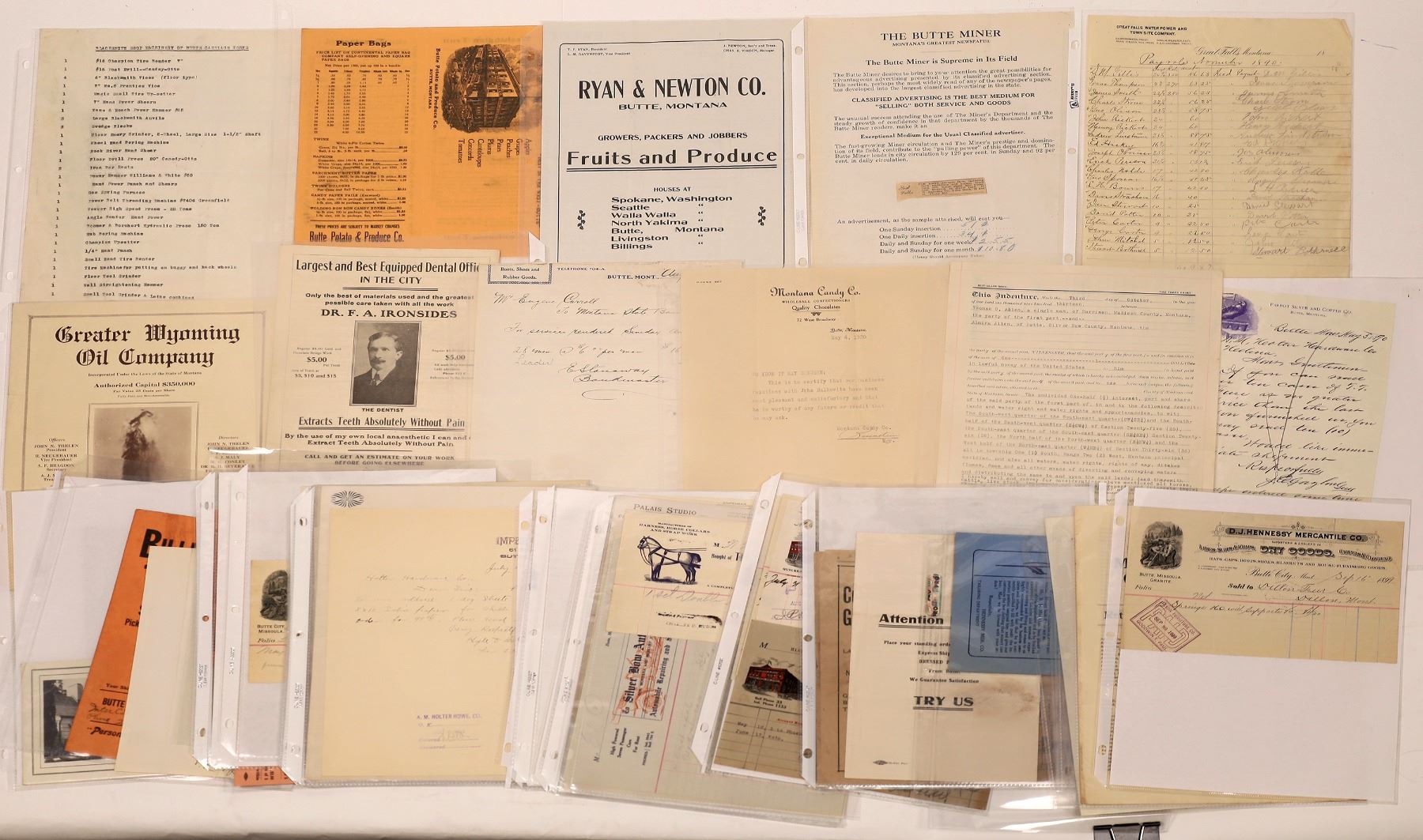 A large collection of business receipts, billheads and other documents from several businesses in and around the Butte, Montana area. Included Great Falls Bottling Works, Montana Liquor Company, Olson& Christian Company, Speedway Stables, The Silver Bow Harness Shop, my favorite, Dr F.A. Ironsides and his $5 gold crown deal that offers his own local anaesthetic (sic) and many more. Quite a varied collection. Please see photos for more detail and condition.