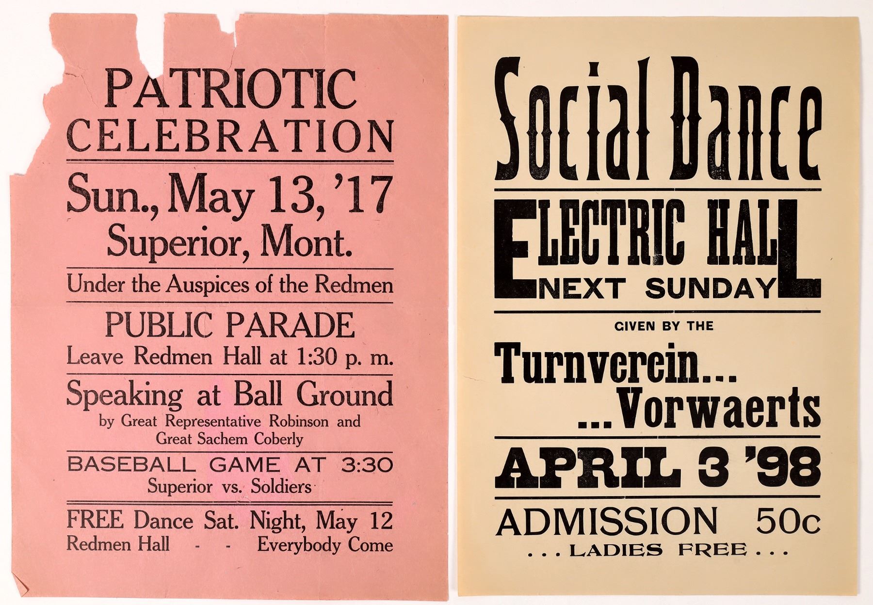 2 Montana broadsides. 1998 Electric Hall Social Dance, 11.5x8". 1917 Patriotic Celebration, 12x9", chips and tears, please inspect.