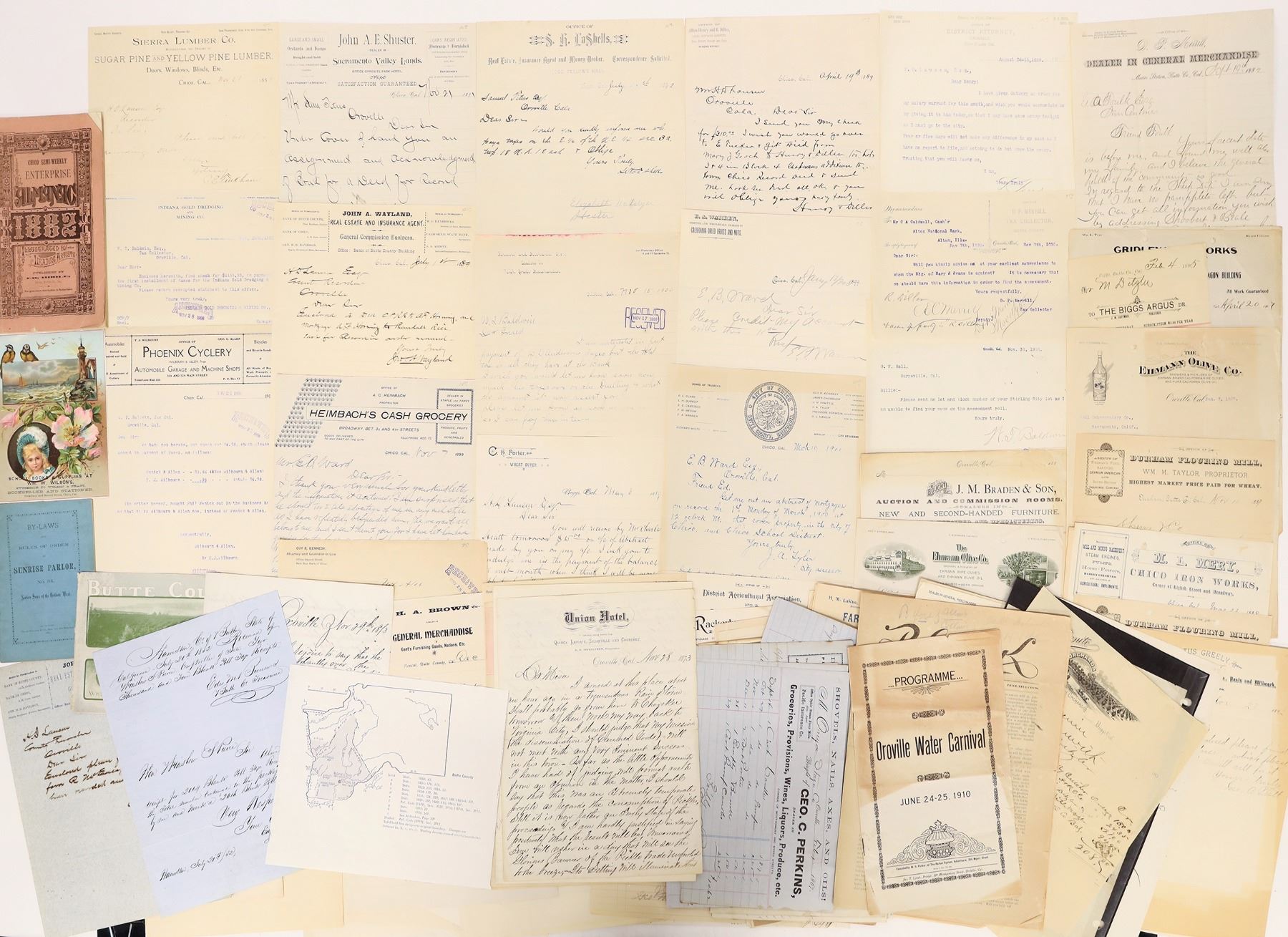 Collection of Butte County ephemera, perhaps 60 or more pieces, c. 1873-1914. Mostly Chico and Oroville. Letterheads and billheads with some pictorials, Moore's Station, Native Sons of the Golden West bylaws 1885, letters, Chico Almanac 1882 etc. Butte County California