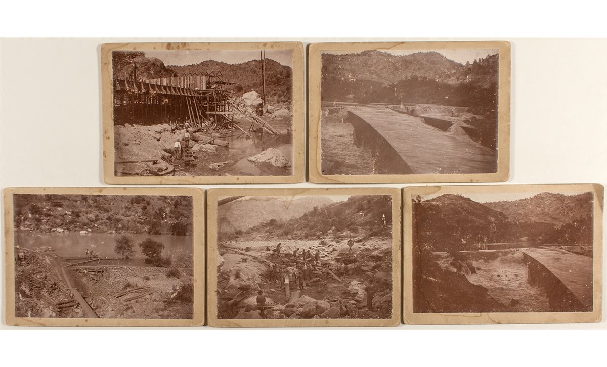 Set of 5 cabinet photos. Each measures 7 1/2" x 5 1/4." Five different views of mining scenes along the river. Miners are moving the river so that they can mine the river bed, including installing a flume to redirect the water. This is most likely the Feather River. Great look at a feat of mining engineering at the turn of the century! Condition: soiling and possible water damage, most noticeable on the backs of the photos. Some photos have scratches. Even with damage, photos are still very presentable and tell an interesting story. Butte County produced over three million ounces of gold from 1880-1959, most from placers.