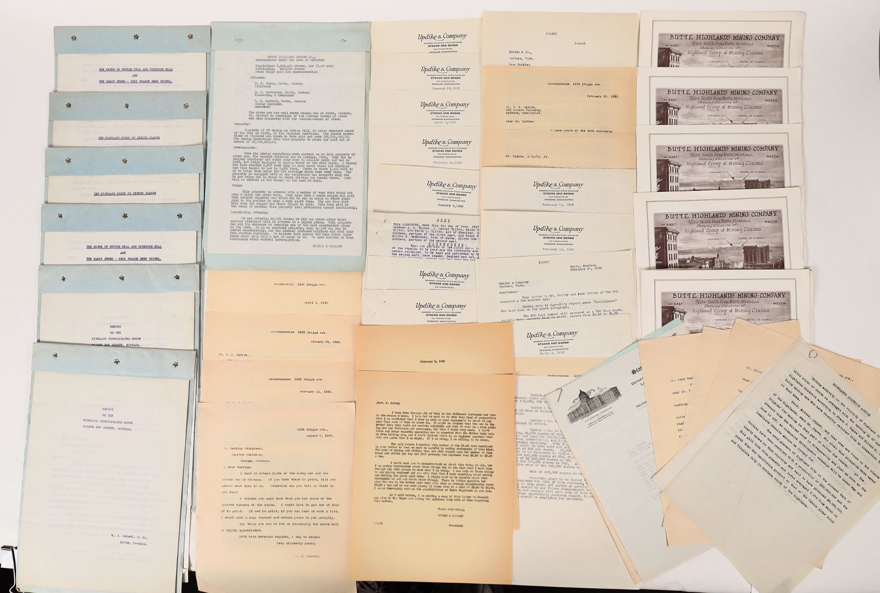 About 40 pieces of Butte Highlands Mining ephemera. Includes promo sheets, map, correspondences, several mining reports with claim info etc. Butte Montana
