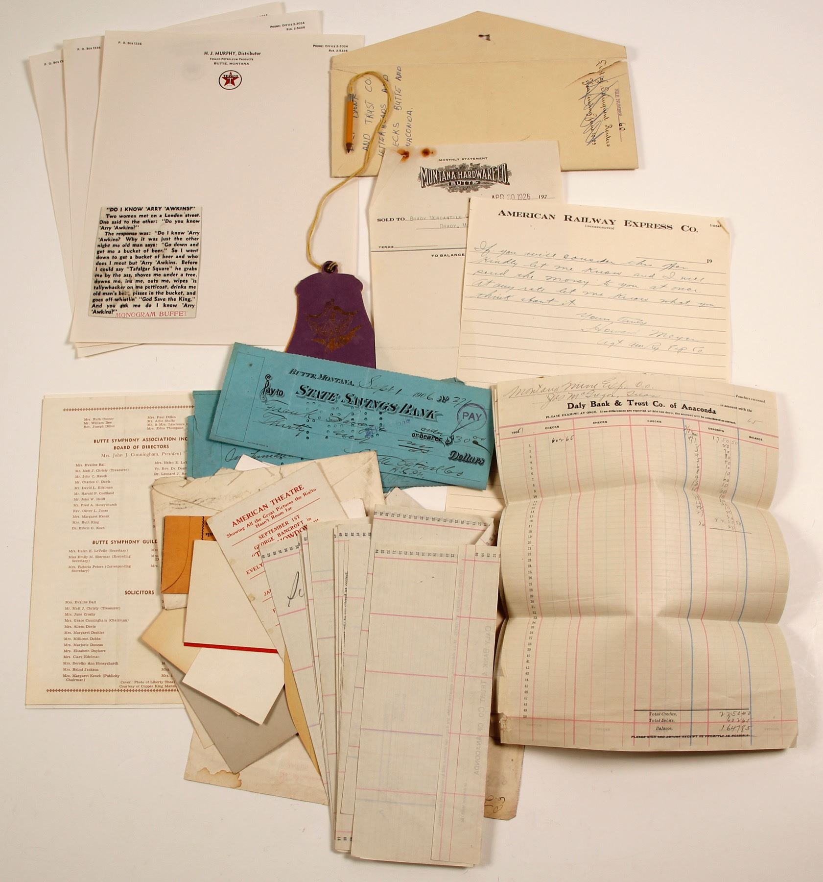 2 checks from State Savings Bank 1906, assorted trade cards, program from 1946 Butte HS Commencement, Texaco letterheads, Montana Mine Exp. Co bank deposit statements c. 1907, Montana Hdwe 1926 billhead and maore. State: Montana City: Butte Date: HWAC# 86422