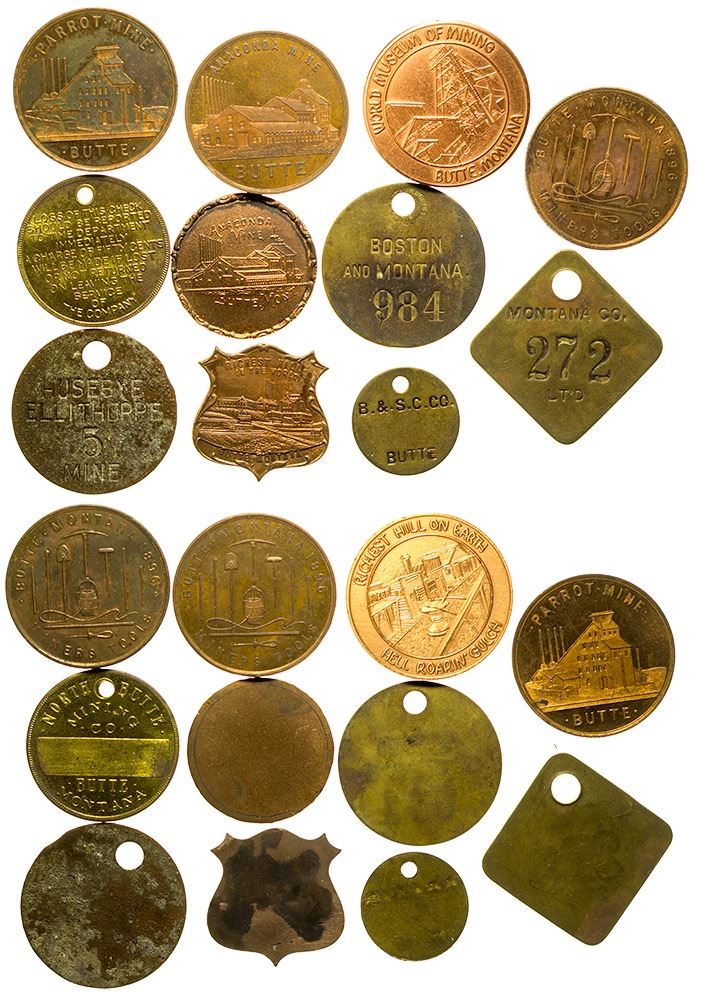 11 pieces. 5 tool ID Tags, and 6 souvenir pieces all related to various Butte area mining operations. (Svoboda Collection) City: Butte State: Montana Date: HWAC# 35942