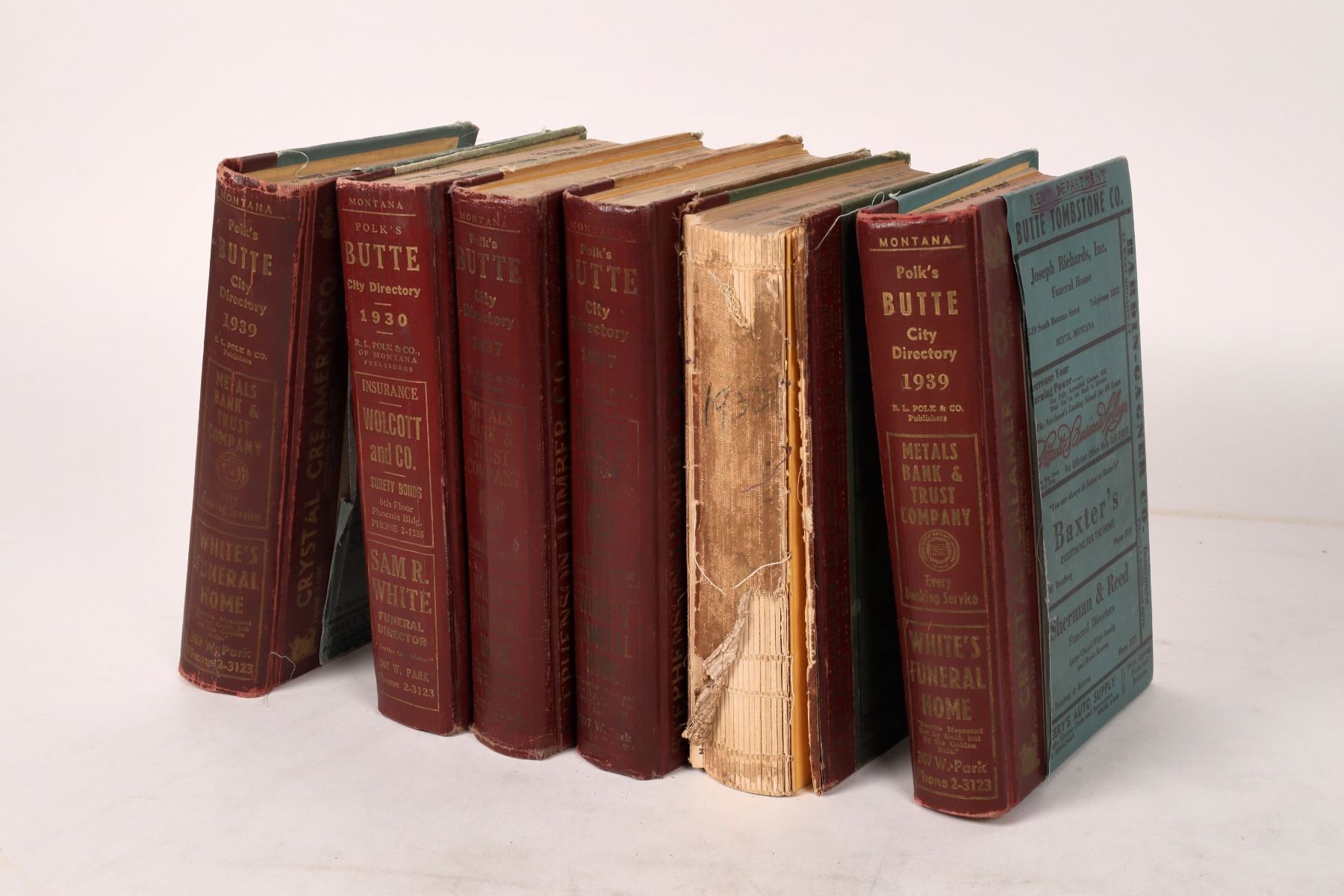 6 Montana directories. 1930 (2) 1937 (2), 1939 (2) Polks Butte city directories. Varying condition. Excellent reference material.