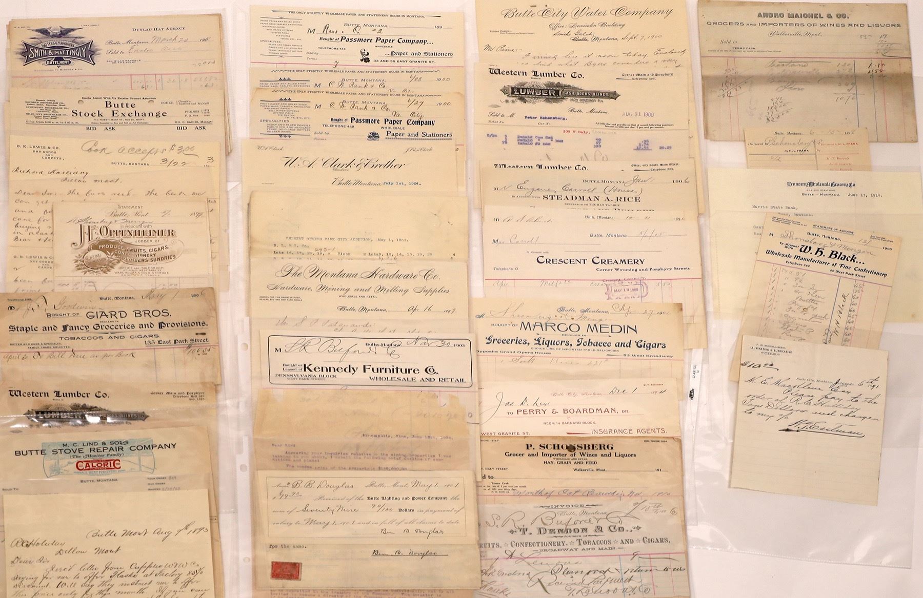 A collection of approximately 60 letterheads and billheads from the Montana town of Butte from the late 1800's to the early 20th century. There are several retail as well as service company bills and receipts and ledger pages, include Butte City Water Company, The Velvet Ice Cream Company, Montana Drug Company, The Walkerville Bakery and more. Fascinating look at the past. Please see photos for more detail and condition.