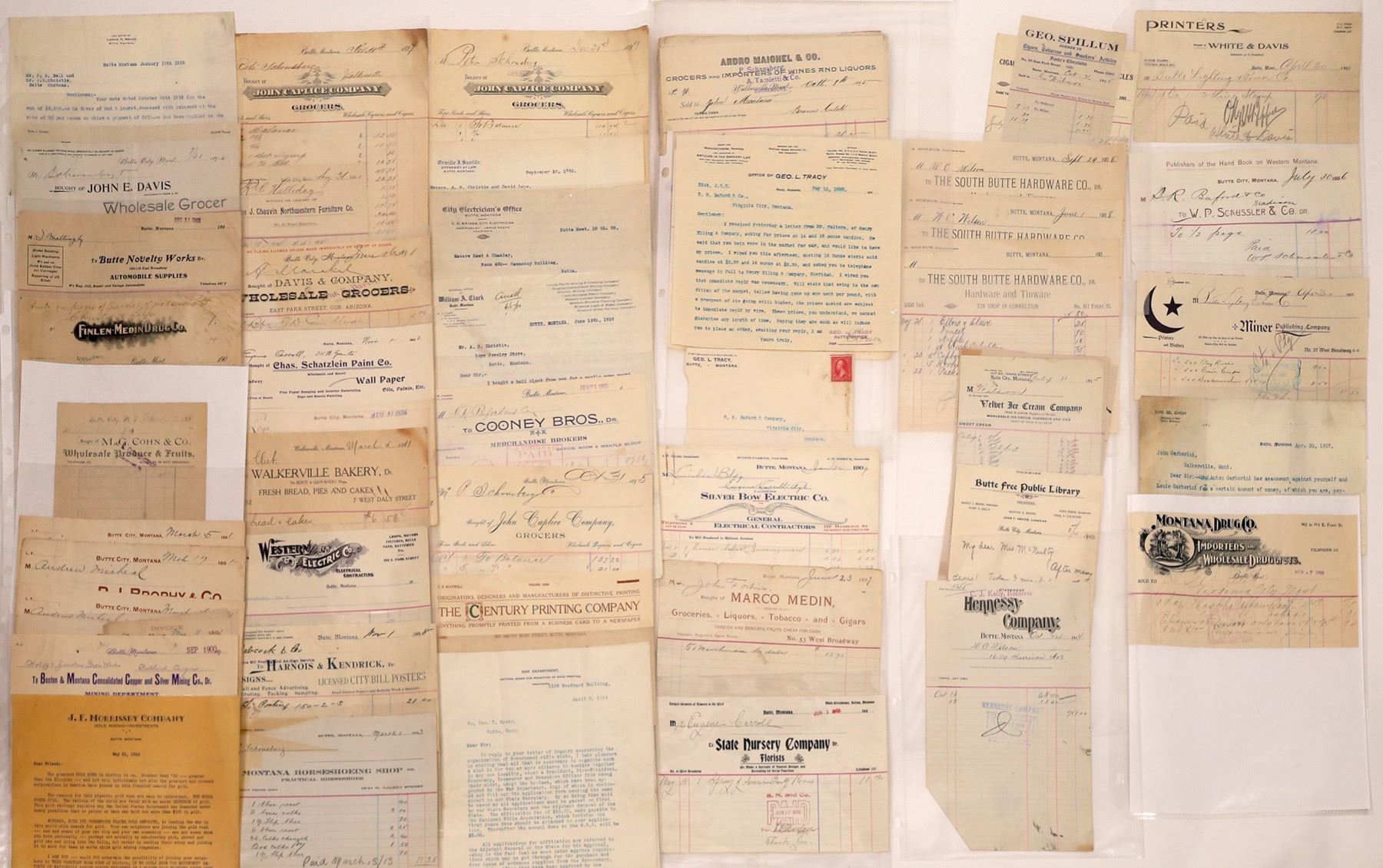 A collection of approximately 60 letterheads and billheads from the Montana town of Butte from the late 1800's to the early 20th century. There are several retail as well as service company bills and receipts and ledger pages, include Butte City Water Company, The Velvet Ice Cream Company, Montana Drug Company, The Walkerville Bakery and more. Fascinating look at the past. Please see photos for more detail and condition. State:Montana City:Butte Date:1800's-1900's Provenance: Stuart Mackenzie Montana Ephemera Collection