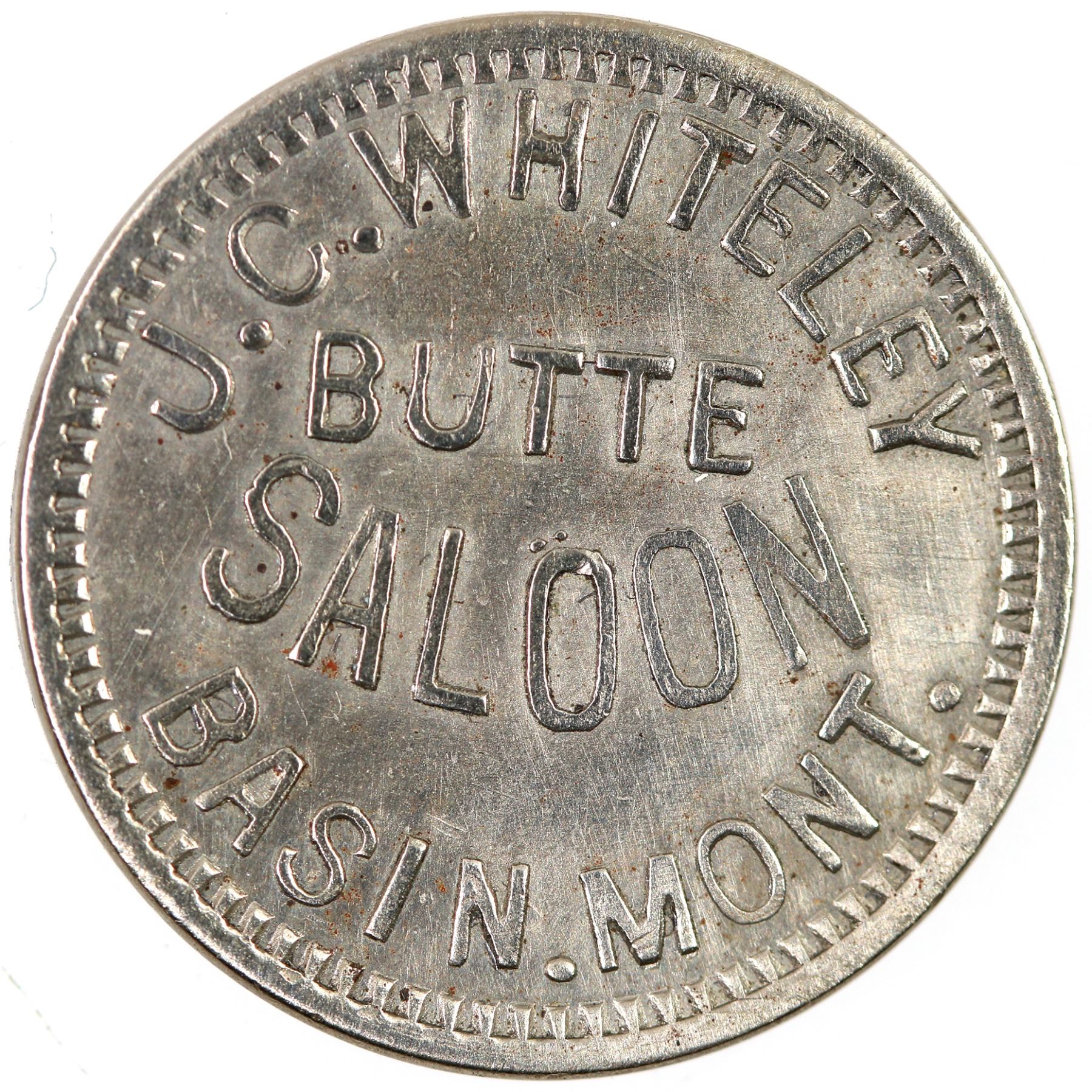 J.C. WHITELEY / BUTTE / SALOON / BASIN. MONT. // GOOD FOR / ONE / DRINK / OR / CIGAR; Wm, rd., 21 mm.[ Basin Montana