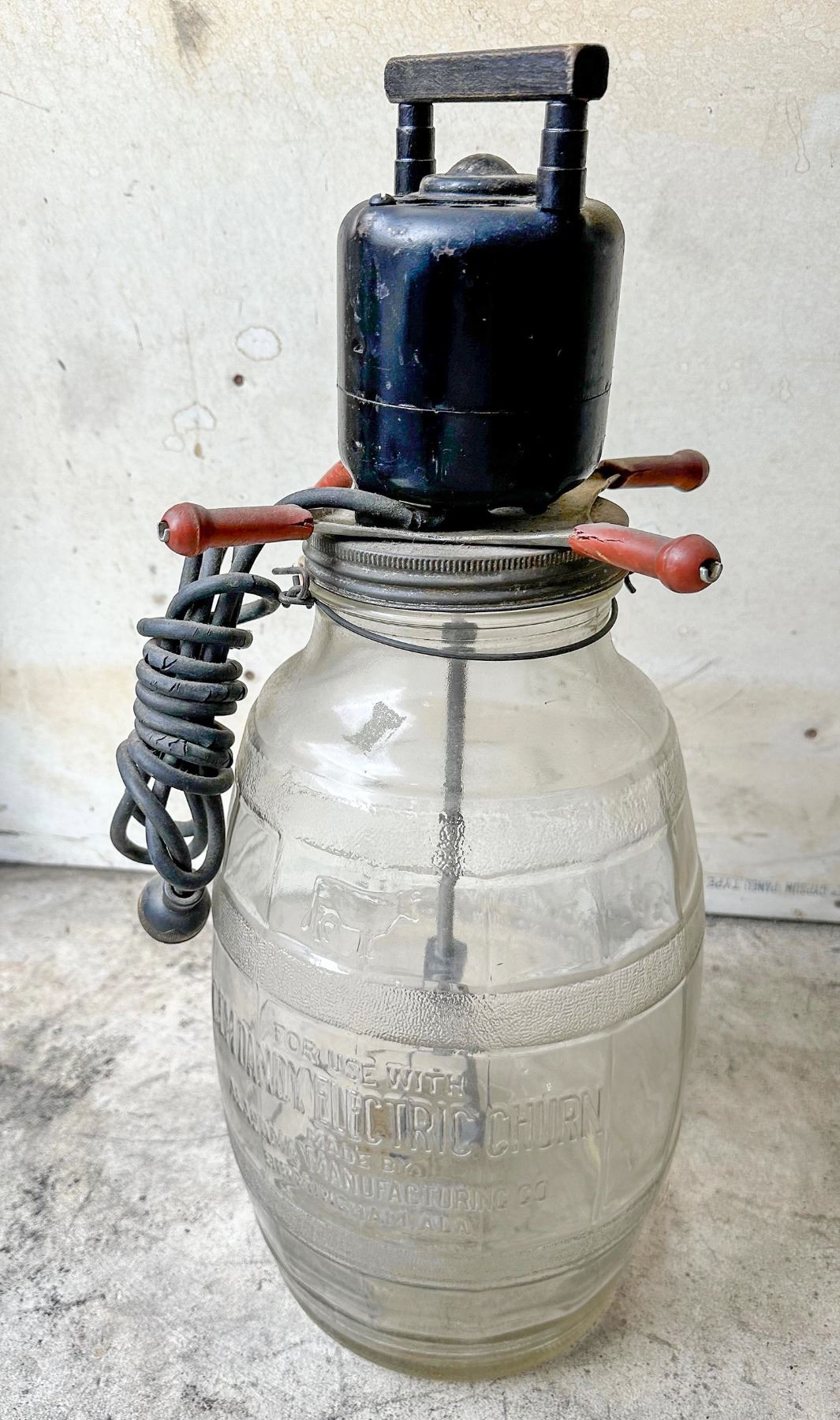 Two and a half gallon embossed bottle with butter churn parts and motor, appears complete. Glass bottle 23" tall, 8" diameter. "Gem Dandy Electric Churn, made by Alabama Mfg, Birmingham, AL" Bracken Collection. c 1930-40. Alabama Birmingham