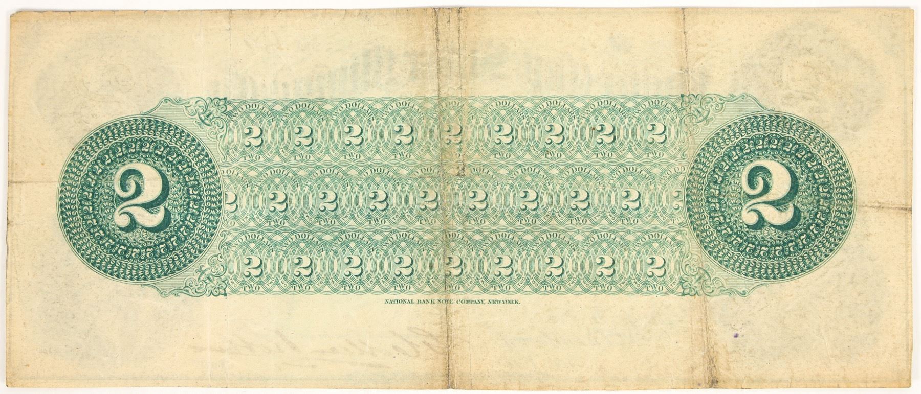 Extremely rare. Ex. John J. Ford Collection. Two dollar note issued Oct. 1st, 1871. Signed by the superintendent. Located in New York Canyon near Eureka, the Butter Cup mine was a real producer beginning in 1867. By the 1870s silver and gold coins were scarce and had to be shipped in weekly to meet pay role. The Butter Cup management decided to issue this scrip to reduce the volume of coins every week. Not only was this illegal but the miners refused to accept anything but gold and silver for their wages. These notes, printed by the National Bank Note Co., are very seldom encountered and then almost always as unissued remainders. This issued $2 note features detailed engravings of two women. This is an extremely rare obsolete note. 3 x 7"