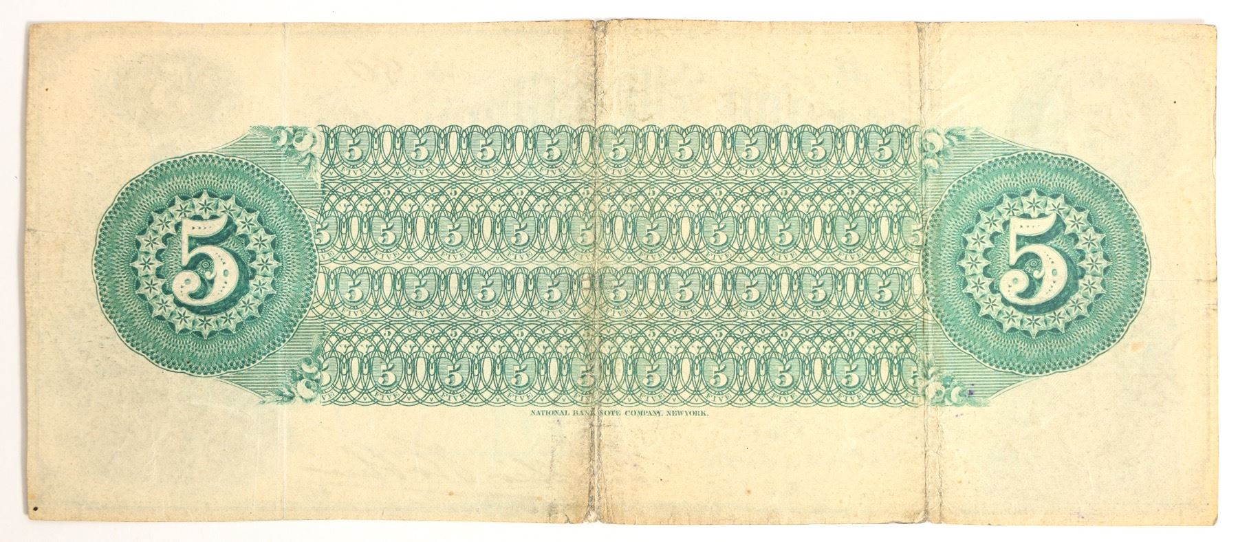 Extremely rare. Ex. John J. Ford Collection. Five dollar note issued Oct. 1st, 1871. Signed by the superintendent. Located in New York Canyon near Eureka, the Butter Cup mine was a real producer beginning in 1867. By the 1870s silver and gold coins were scarce and had to be shipped in weekly to meet pay role. The Butter Cup management decided to issue this scrip to reduce the volume of coins every week. Not only was this illegal but the miners refused to accept anything but gold and silver for their wages. These notes, printed by the National Bank Note Co., are very seldom encountered and then almost always as unissued remainders. This issued $5 note features detailed engravings of a frontiersman and a blacksmith. This is an extremely rare obsolete note. 3 x 7"