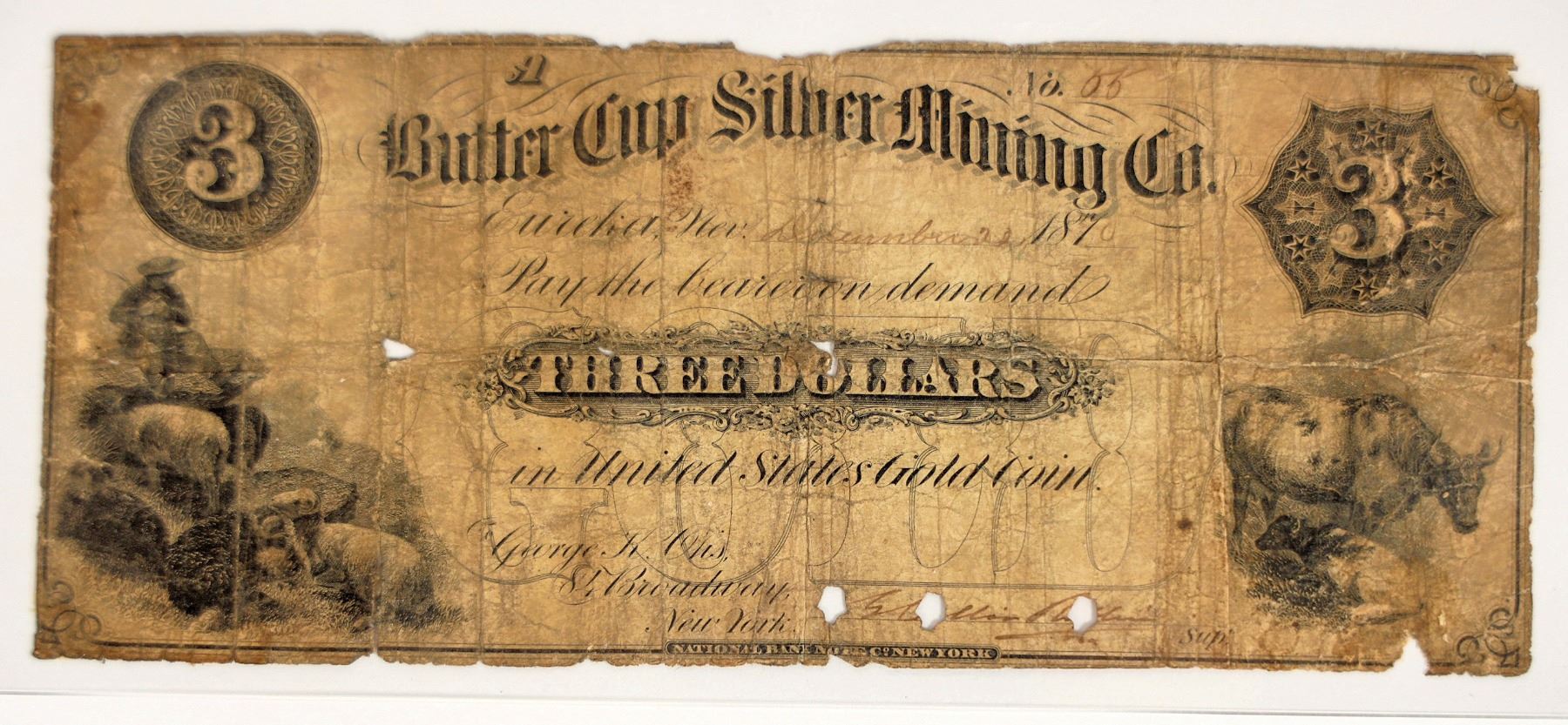 Most of the handful of Butter Cup scrip are unissued remainders. This $3 note was fully issued on December 22, 1870, and was cancelled by three small holes at the signature. Although the condition suffers, this is one of the rarest scrip notes from Nevada.