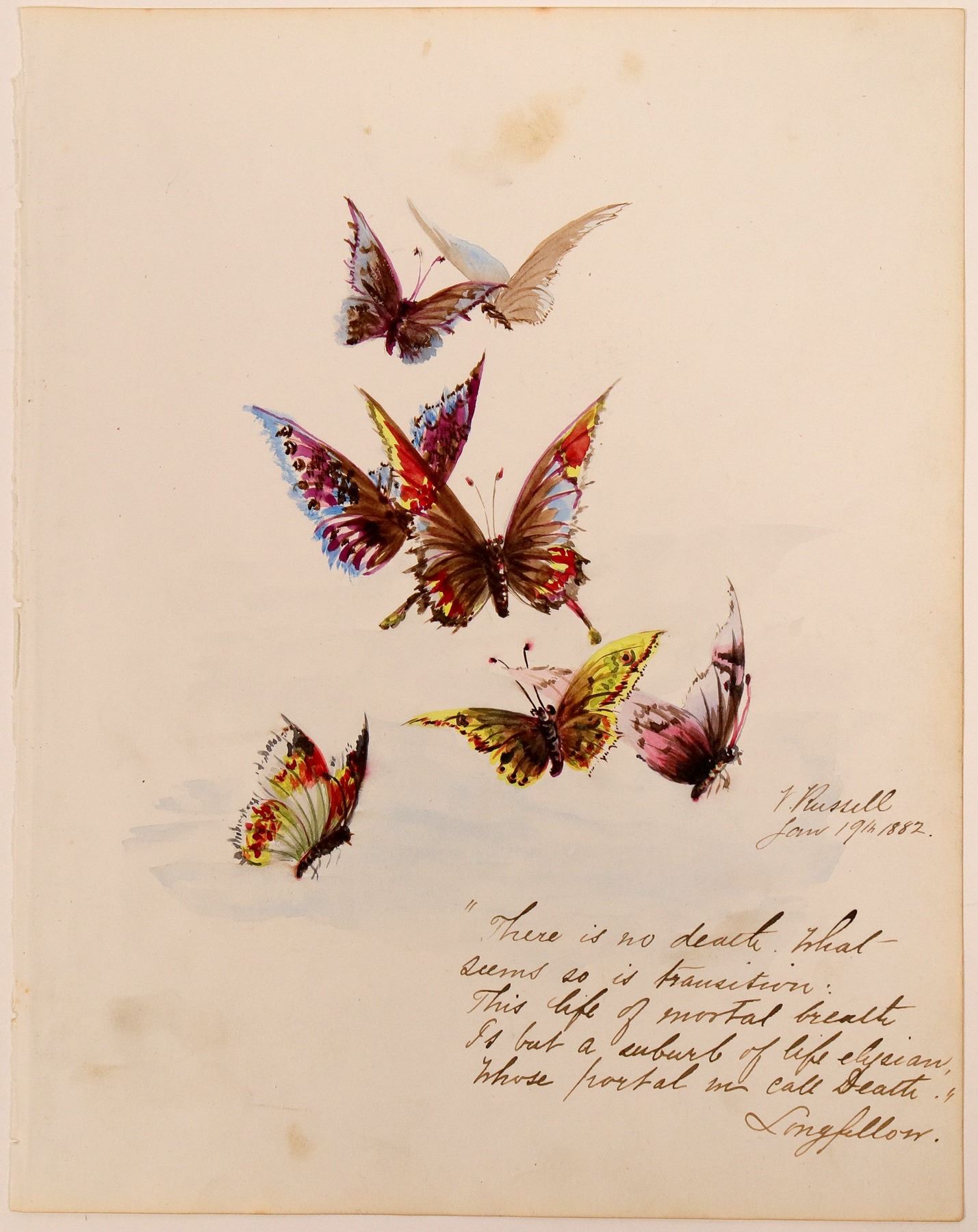 V. Russell's delicate watercolor of butterflies, signed Jan 19, 1882. 9.75" x 7.5", on paper. The poem on the drawing reads: "There is no death. What seems so is transition. This life of mortal breath is but a suburb of life elysian, whose portal we call Death." Henry Longfellow.