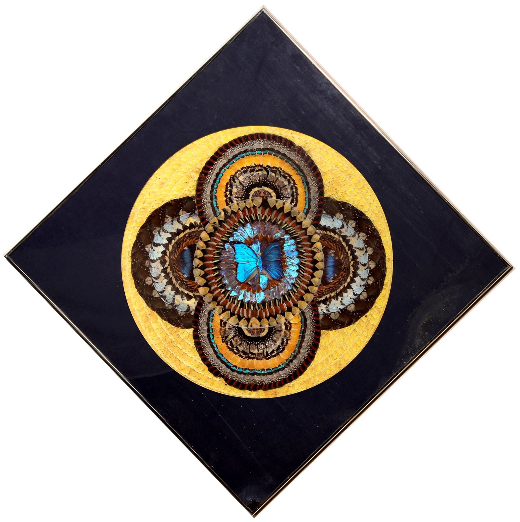 Spectacular butterfly art in a 32-1/4 inch square framed designed to be hung diagonally. 24-inch diameter circular matte. See photo for design details.
