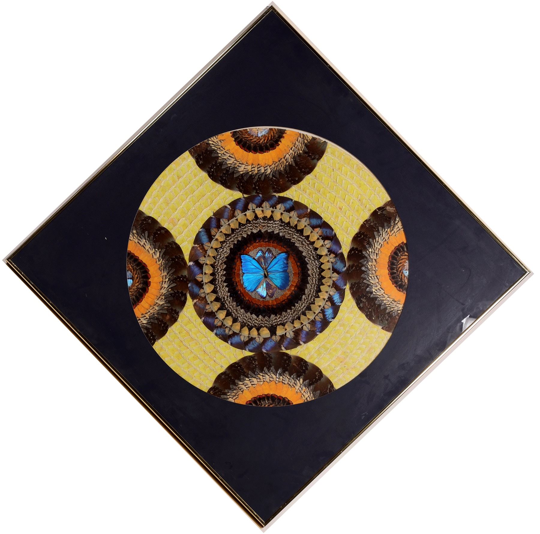 Spectacular butterfly art in a 32-1/4 inch square framed designed to be hung diagonally. 24-1/4 inch diameter circular matte. See photo for design details.