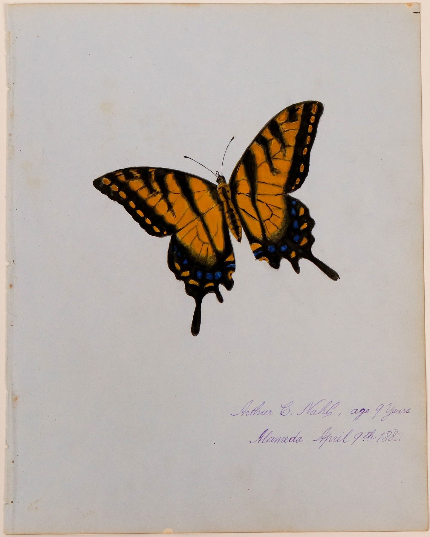 Beautiful small gouache painting on paper by Arthur Charles Nahl. The painting is signed Arthur C. Nahl, age 9 years / Alameda, April 9th 1882. 9.5" x 7.5", on paper. Arthur was the son of Hugo Wilhelm Arthur Nahl and Annie Sweeney Nahl, and the father of Marion, Phyllis (Antonia Cobos) a dancer and choreographer, and Marjorie Nahl, an impressionist artist. The women were cousins to Malcolm Nahl.