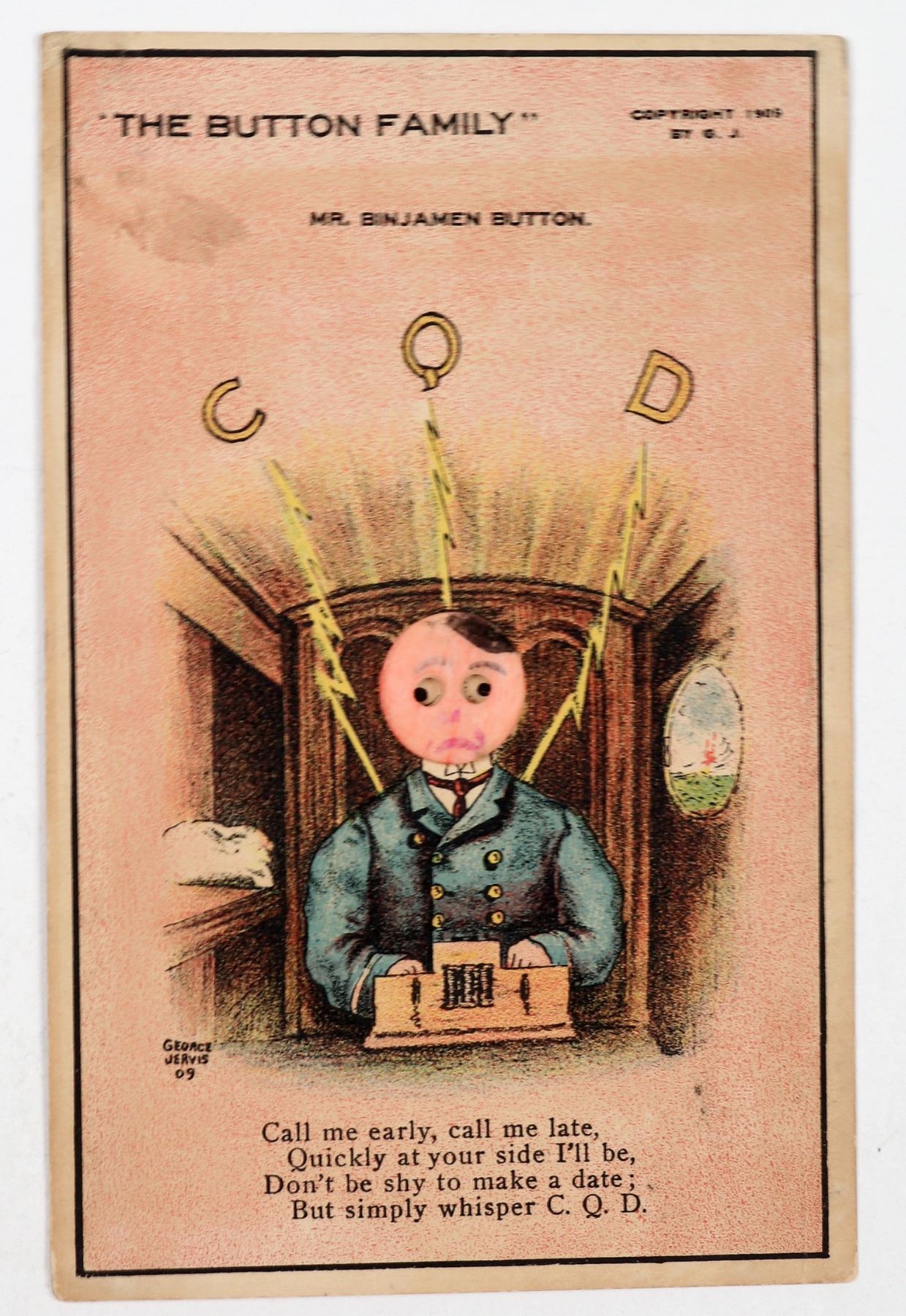 RARE button face postcard, with the saying "Call me early, call me late. Quickly at your side I'll be. Don't be shy to make a date. But simply whisper C,Q,D "Card has been used. Please see photos for more details.