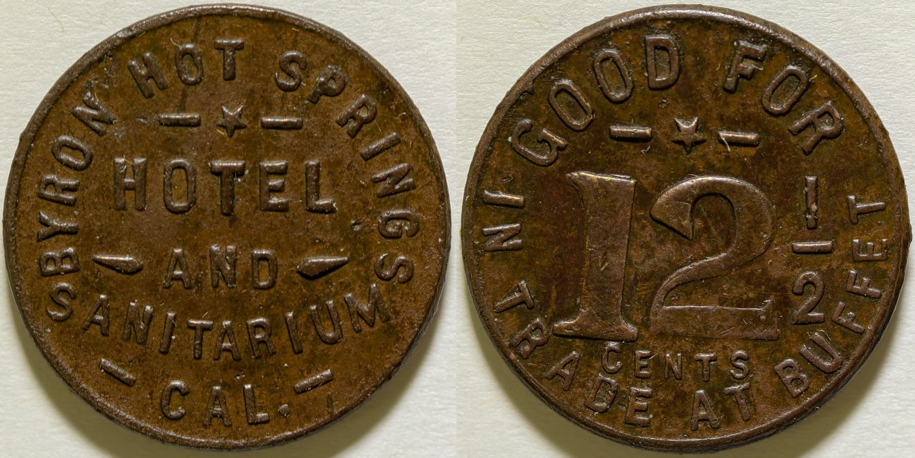 Obv.: Byron Hot Springs / Hotel / And / Sanitarium / Cal.; Rev.: Good For / 12 1/2 / cents / In Trade At Buffet; Br. rd., 21 mm. EF-AU condition.