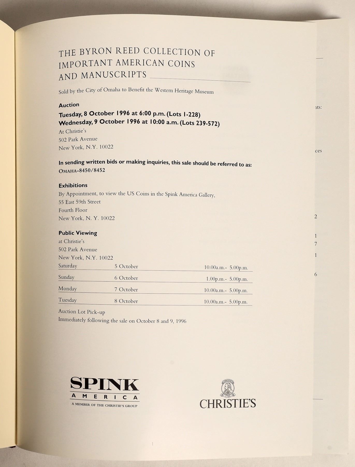 Hard cover volume with dust cover, published by Christie's of New York for the October 8 & 9,1996 auction of Byron Reed collection sold by the City of Omaha. The collection consisted of choice American coins and historic manuscripts.
