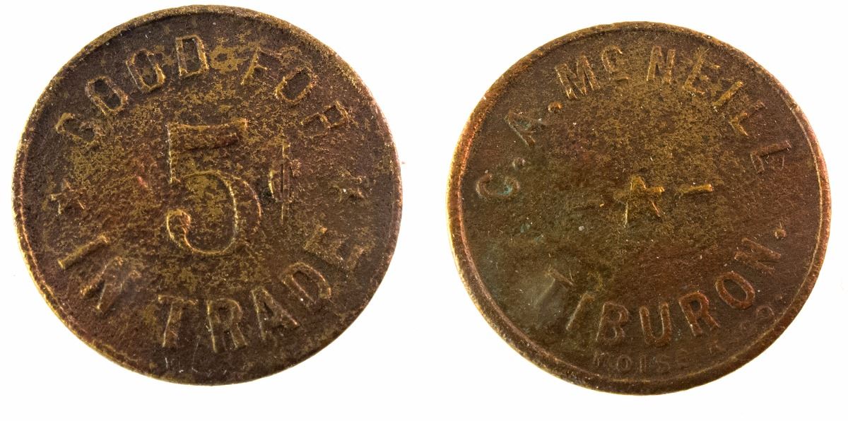 Good for five cents in trade. C.A. McNeil, Saloon, Tiburon, CA. as listed in 1906 & 1908 Dun. Light pitting. Extremely rare, one of the best California towns. State: California City: Tiburon Date: FHWAC#: 43575