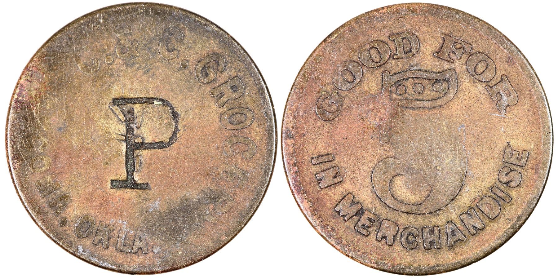 C. & C. GROCERY / DECOMA, OKLA. // GOOD FOR / 5 / IN MERCHANDISE; Br., rd., 21 mm, counterstamped "P".