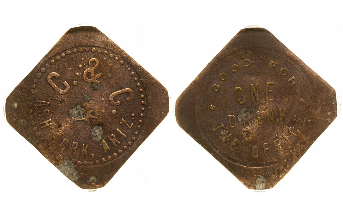 Obv.: C & C / Ashfork, Ariz.; Rev.: Good For / One / Drink / The Office; square, R8, NCS genuine.