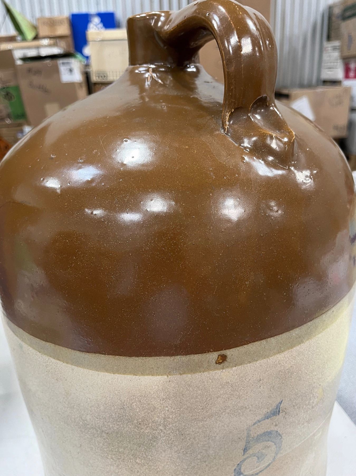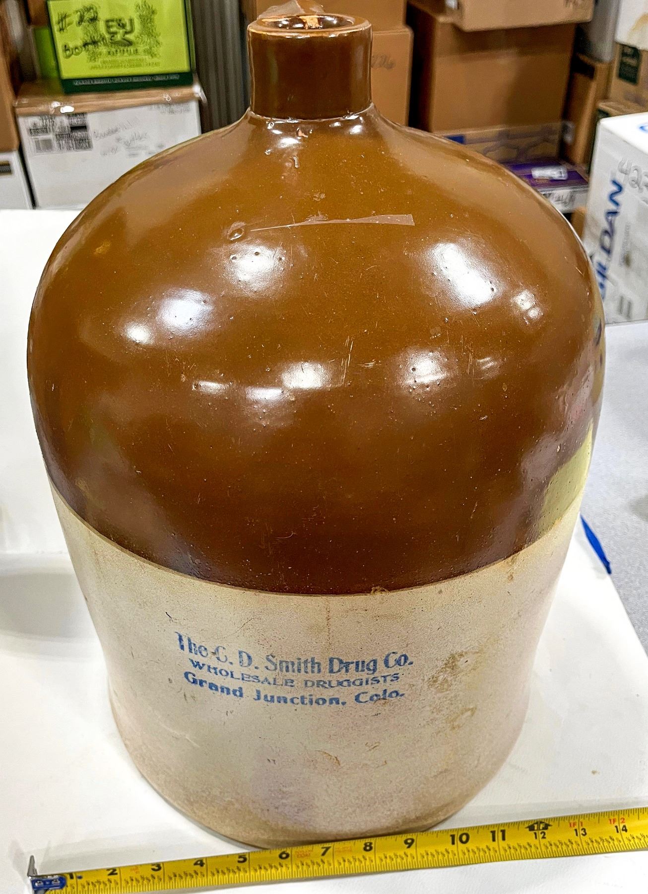 J160 in Preble. The C. D. Smith Drug Co./Wholesale Druggists/Grand Junction, COLO. Brown top. 17x12" 5 gallon, nice display piece. Lip wear.